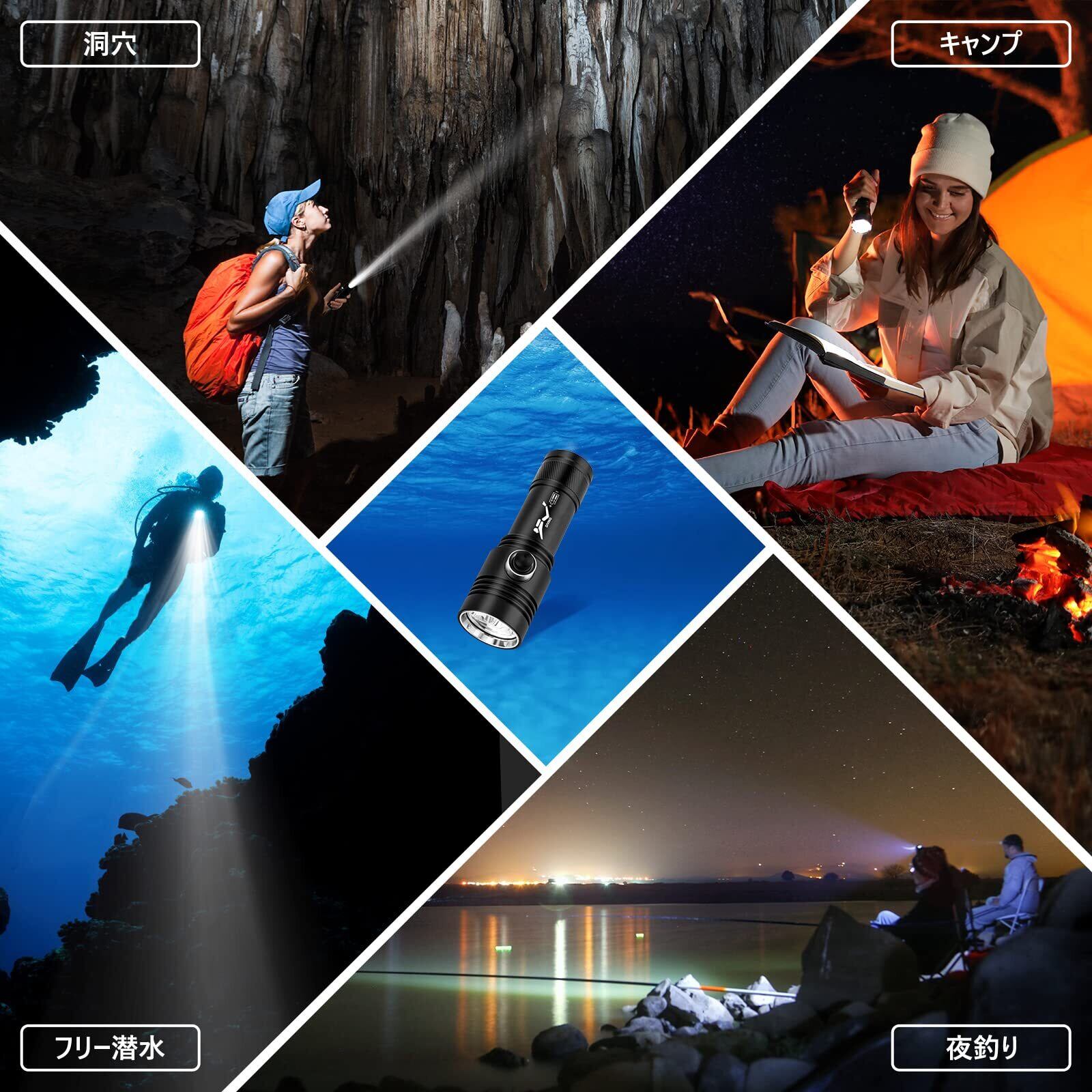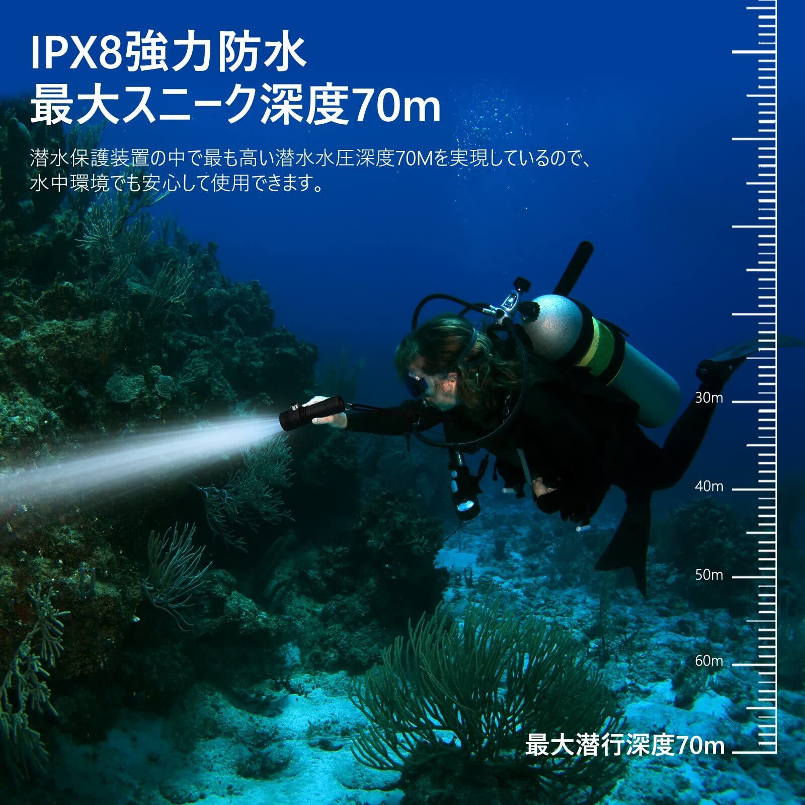 【IPX8防水仕様】このダイビングライトはユニークな密閉デザイン、IPX8強力防水、水圧に強いマグネトロンスイッチ設計で、水中70Mまで平気に使用可能です!そして、水中に有効的な照射距離は最長500メートルまではっきり照らせます。ダイビングライトだけではなく普通の生活防水ライトとしてもお勧めします。(ご注意:水圧により水漏れする可能性があるので、水中でダイビングライトのスイッチを入れないでください。潜水を開始する前にスイッチをオンにしてください。)