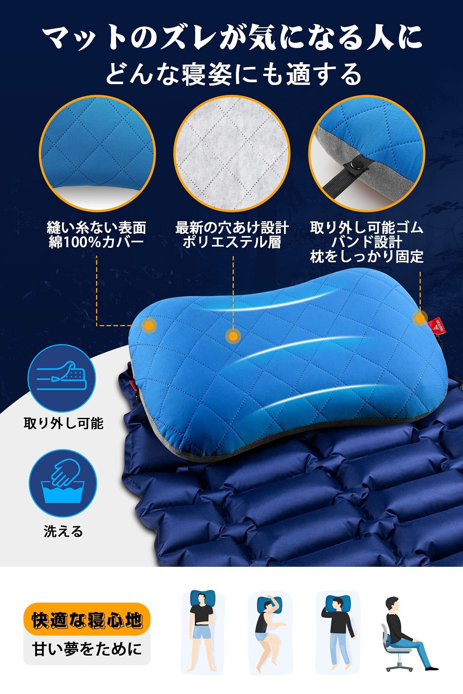 【絶妙な使用感・快適さはここから始まる!】このキャンプ 枕はコットンカバー付きで、通気性、柔らかの触感を提供します。枕カバーが汚され場合、クリーニングのために取り外すことができます。人間工学に基づいたエアー枕は、頭から首までしっかりサポートします!