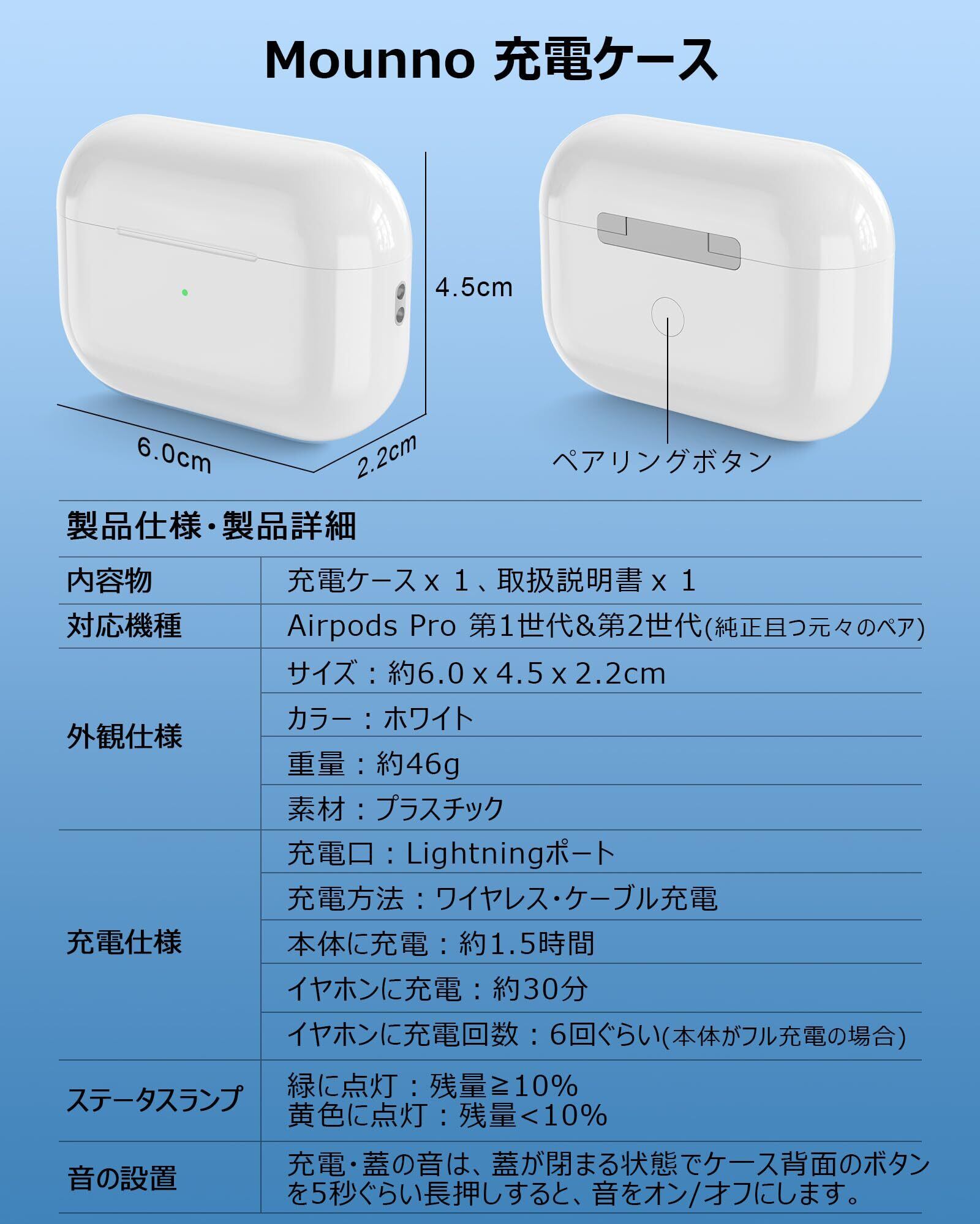 Mounno 【2024最新型】充電ケース、Airpods Proとの互換性あり、 Airpods Pro 第1世代&第2世代 交換用充電ケース、エアーポッズ プロ 1&2 用充電器 ペアリング機能 イヤフォンなし