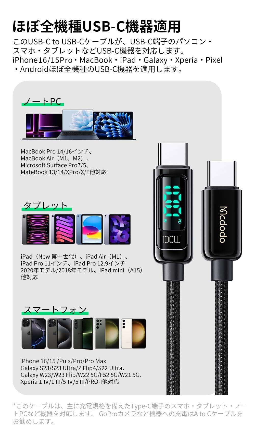 【Type-C端末を高い互換】:ノートパソコン:MacBook、Lenovo、Microsoft、Dell、HP、Acer、Huawei、Xiaomi、ASUSなど対応します。タブレット:iPad、Huawei MatePad、Galaxy Tabなど互換します。スマートフォン:iPhone 16/15シリーズ、Sony、Samsung、Google、Huawei、Xiaomi、OPPO、VIVOなど互換します。その他:Switch、ワイヤレスイヤホン、ウォッチ、モバイルバッテリーなど機種を互換します。