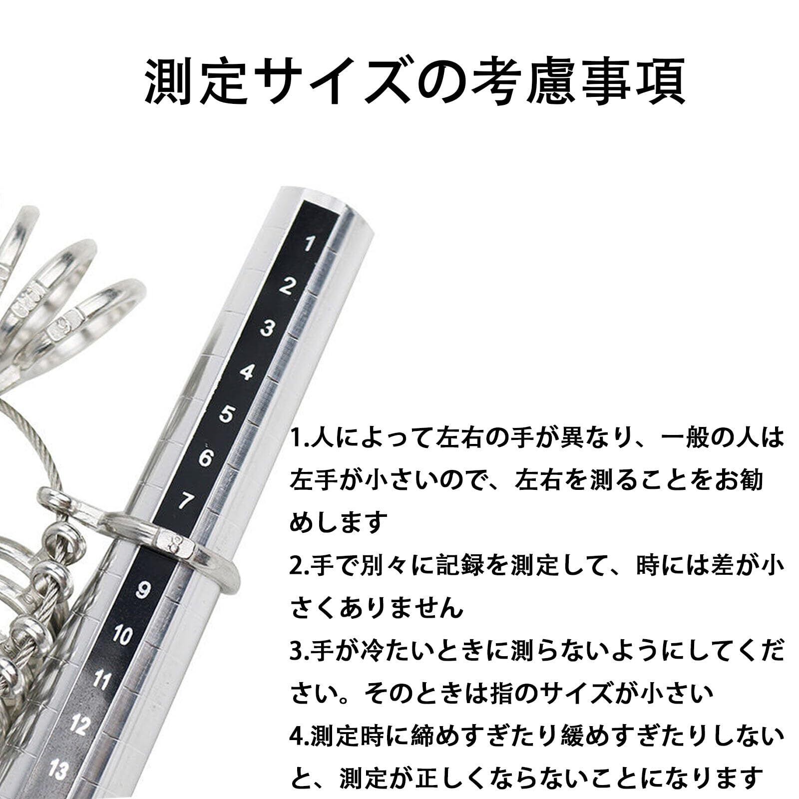 【測定時のご注意】リングゲージ 自体の重さで 指 と ゲージ の間に隙間ができ、実際の サイズ より緩くなる場合があります。測定時には、ワイヤーから外すか手のひらに接地させてお測り下さい。指輪を着ける指の腹より第二関節が太い方は、関節が無理なく通るサイズが適正なサイズとなります。
