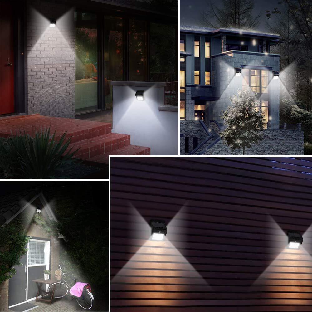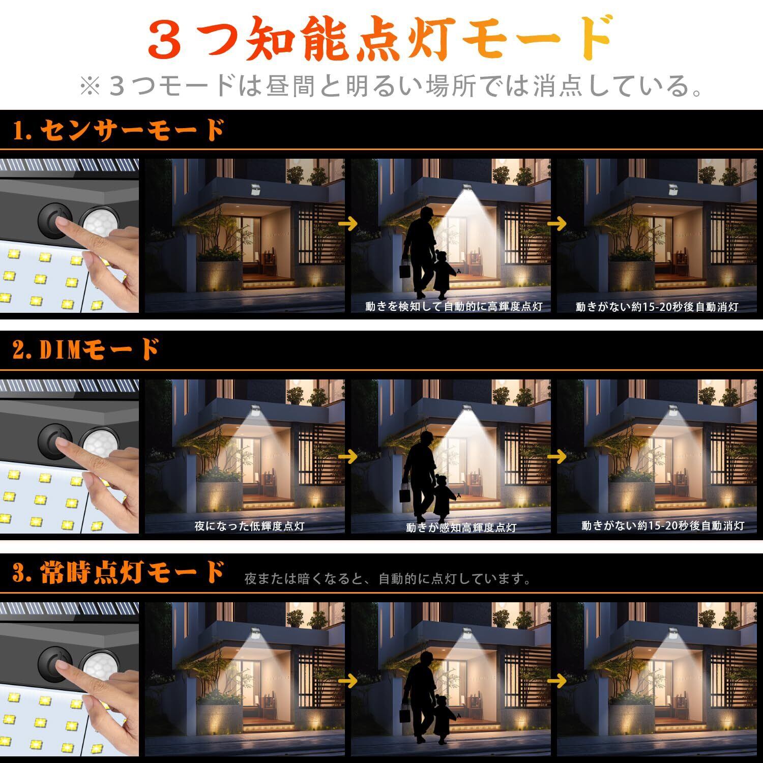 【3つの点灯モード】センサーモード、DIMモード、低亮常時点灯モード3つの知能モードを搭載されてソーラーライトです。人の動きを検知して自動的に点灯するセンサーモードを一番お勧めです。内蔵のPIR動体検知器が人や動物の動きを感知すると、約3-5m・160°以内の動きが感知でき、自動点灯します。深夜に帰宅する時、足元や鍵口がよく見えて便利です。【DIMモード】夜や暗くなると、自動的に弱光点灯します。人や動物の動きを感知すると、自動的に高輝度点灯になって、動きがなくなると約15-20秒後弱い光で点灯状態に戻ります。【低亮常時点灯モード】夜または暗くなると、自動的に弱い光で点灯しています。