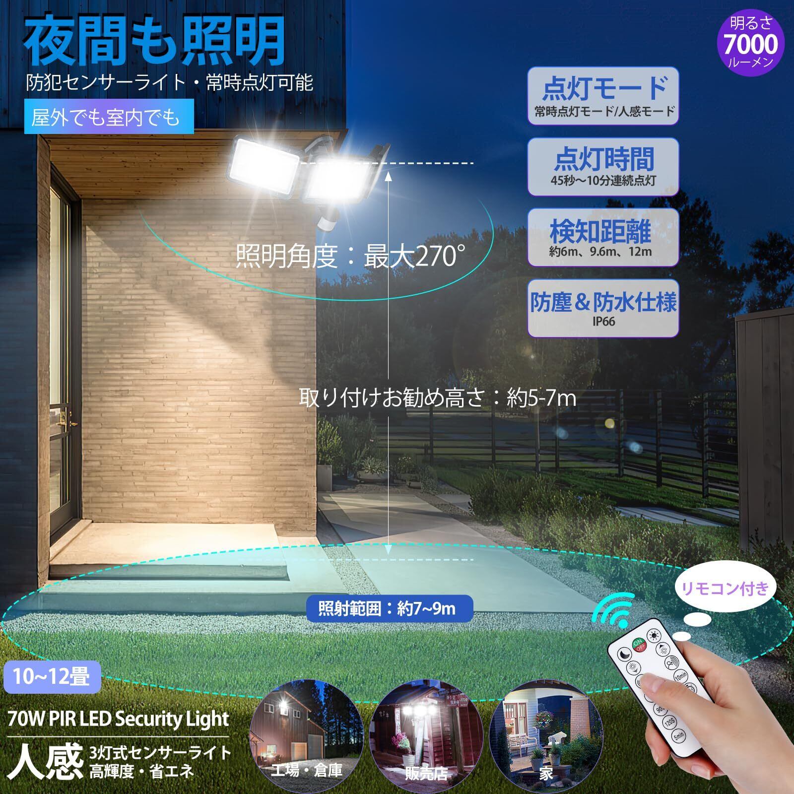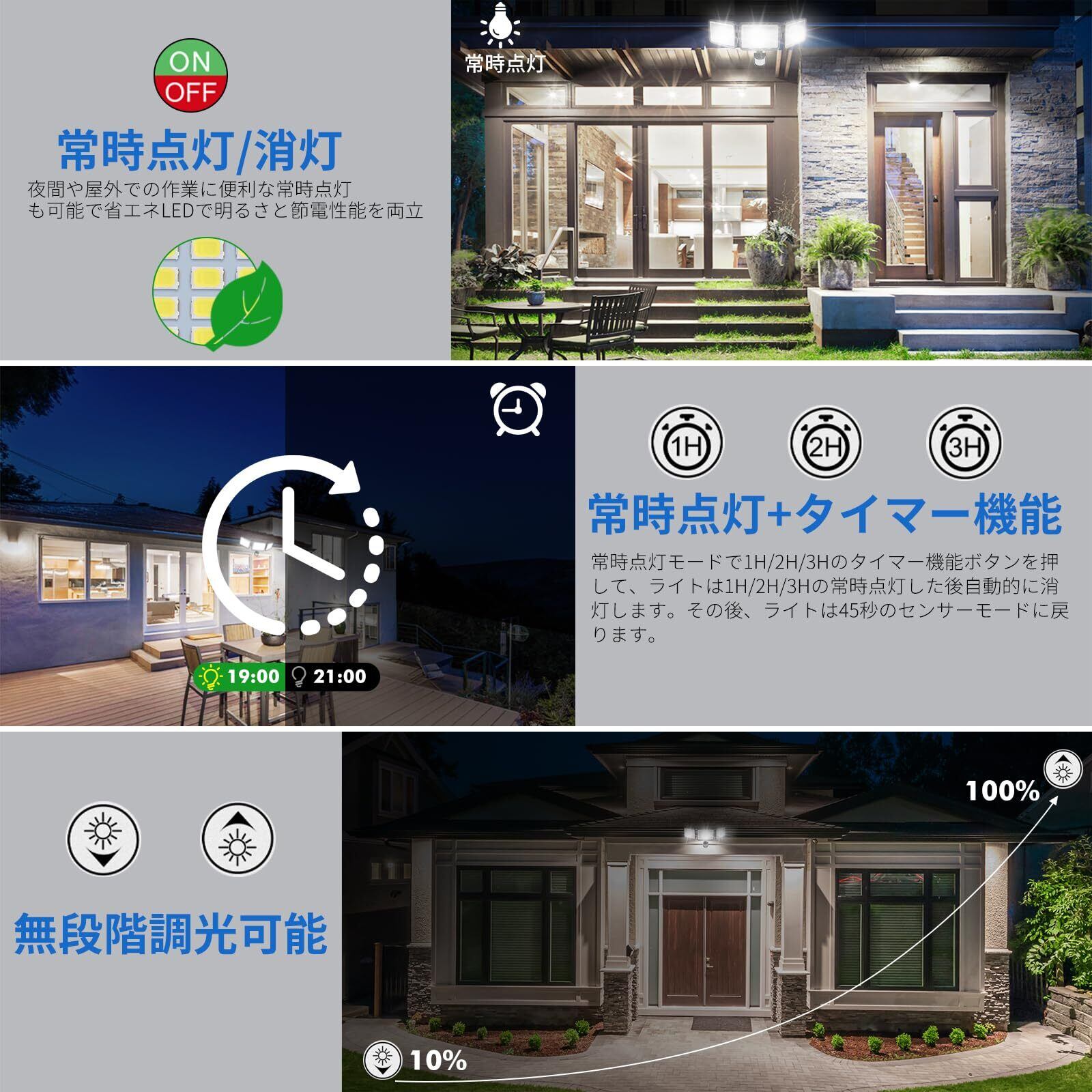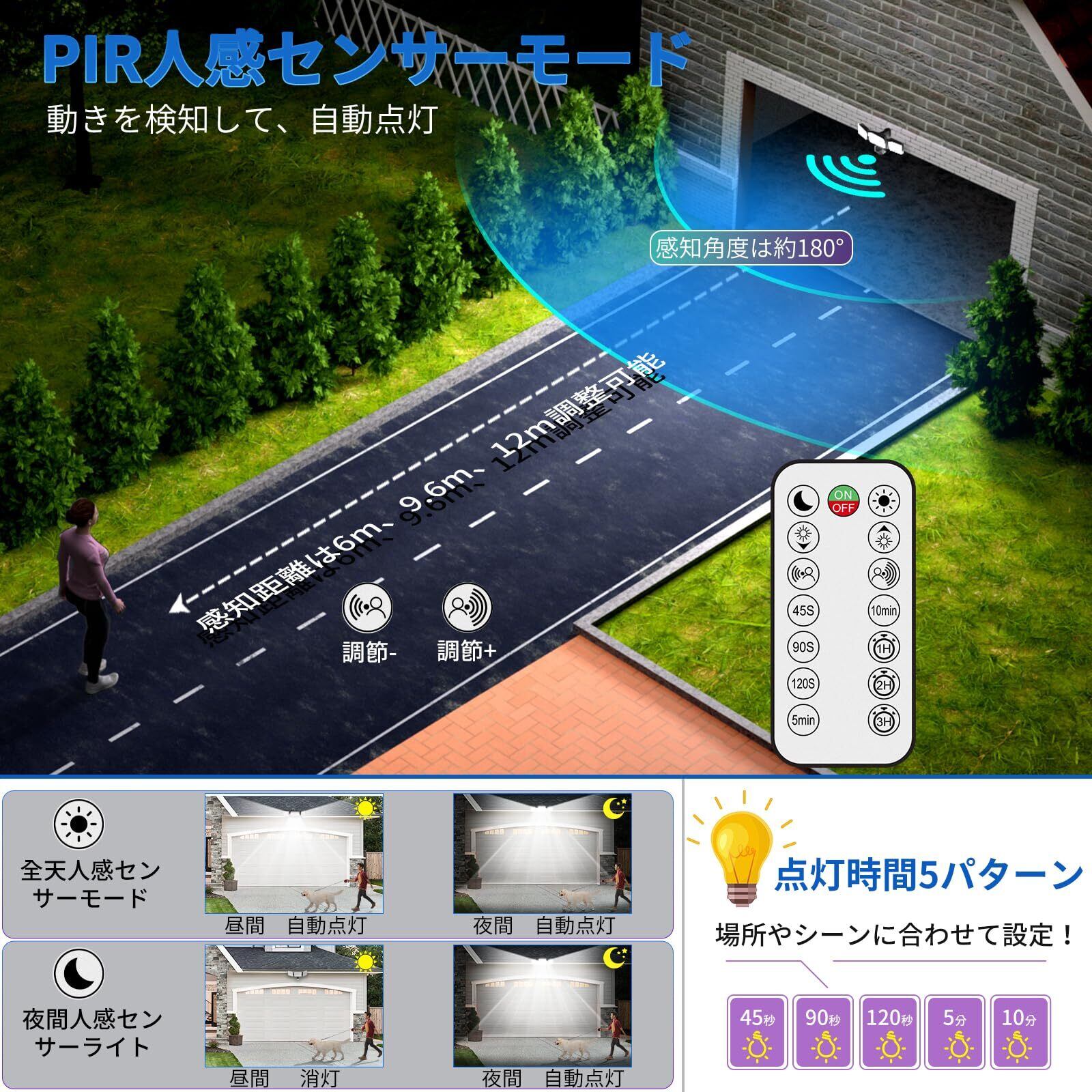 【便利なリモコン操作---点灯時間・検知距離・稼働モード・明るさ調整可能】この高輝度防犯ライトはリモコン付きで操作は自由です。高い所に設置する場合、リモコンで明るさやモードを切り替えができることが便利です。リモコンの最大のコントロール距離は:12m。✦稼働モード設定:昼間モードは全天24時間に人や動物が近づくと自動的に点灯します。夜間モードは夜だけ点灯します。✦点灯時間設定:ライトの連続点灯時間は45秒、90秒、120秒、5分、10分を自由に設定することができます。✦検知距離調整:センサー部の探知範囲水平最大約180度・約12m(目安として高さ約4m-6m設置)。また、センサー部の検知距離は6m、9.6m、12mを設定可能です。✦明るさ調整可能:無段階調光可能です。使用シーンに合わせて、明るさを細かくて調整できてとっても便利で省エネにもなります。【特徴】◆明るさ:強力7000ルーメン ◆常時点灯/常時消灯機能&1H/2H/3Hのタイマー設定可能 ◆無段階調光可能 ◆家庭用100V電源タイプ ◆両側のライトが動き可能、お好みの位置を照らすことができます