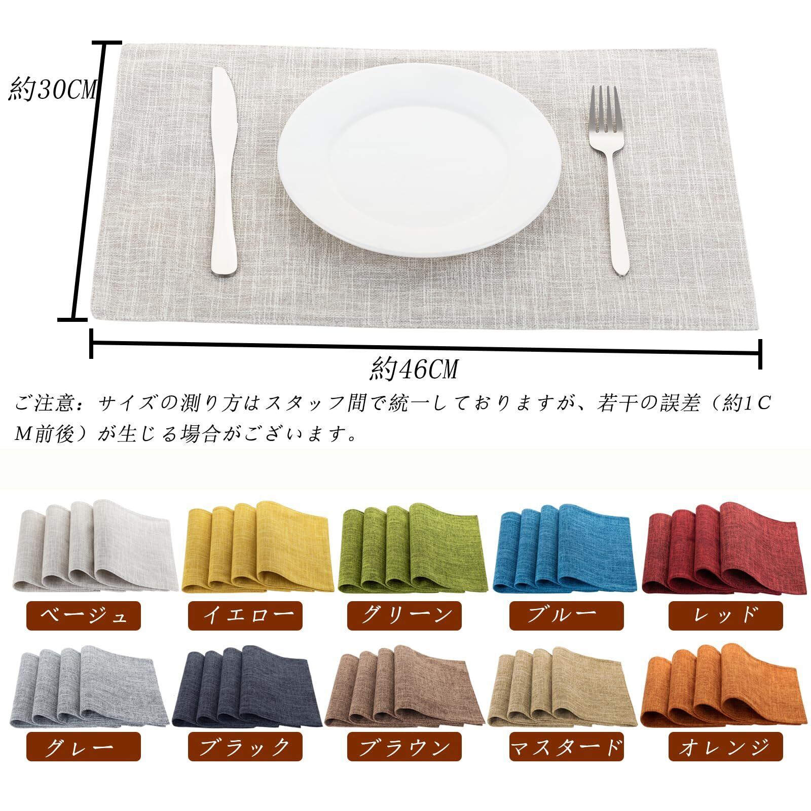 【サイズ&色】サイズ:約46cmx30cm、カラー:ベージュ(4枚セット)、重量:71.7g/枚、材質:綿麻50%・ポリエステル50% 。布地製品ですので数ミリ程度の誤差がある場合がございますが、ご了承ください。