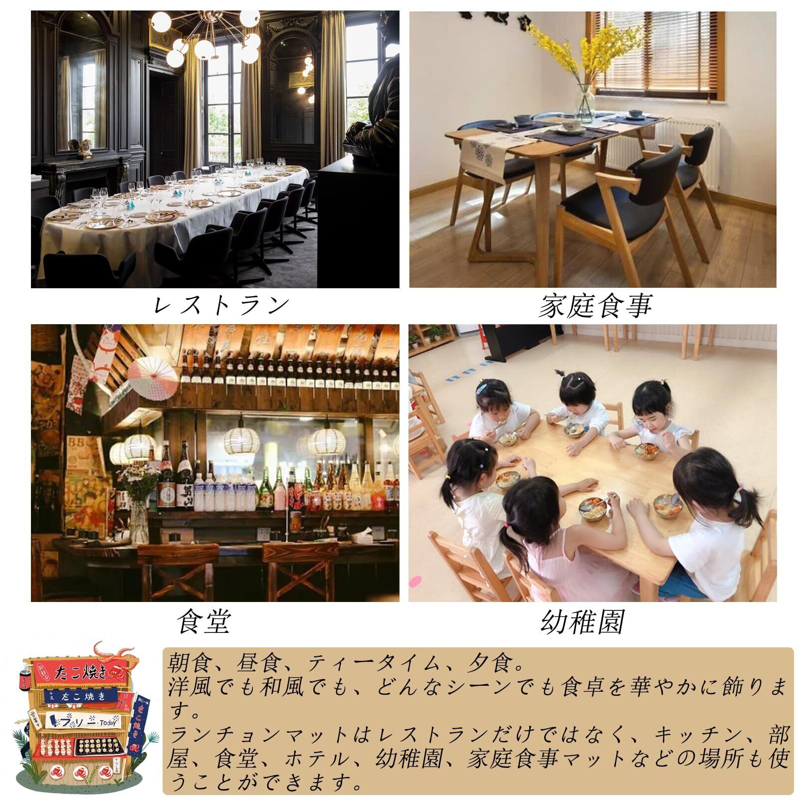 【様々な場所で活躍】ランチョンマットはレストランだけではなく、キッチン、部屋、食堂、ホテル、幼稚園、家庭食事マットなどの場所も使うことができます。ご注意:配送の都合上、折りたたみ状態で配送いたします。それにより折り目が付いている場合がありますが、時間経過と共に消えていきます。お気になる場合は低温でアイロンをかけていただくとより効果的です。