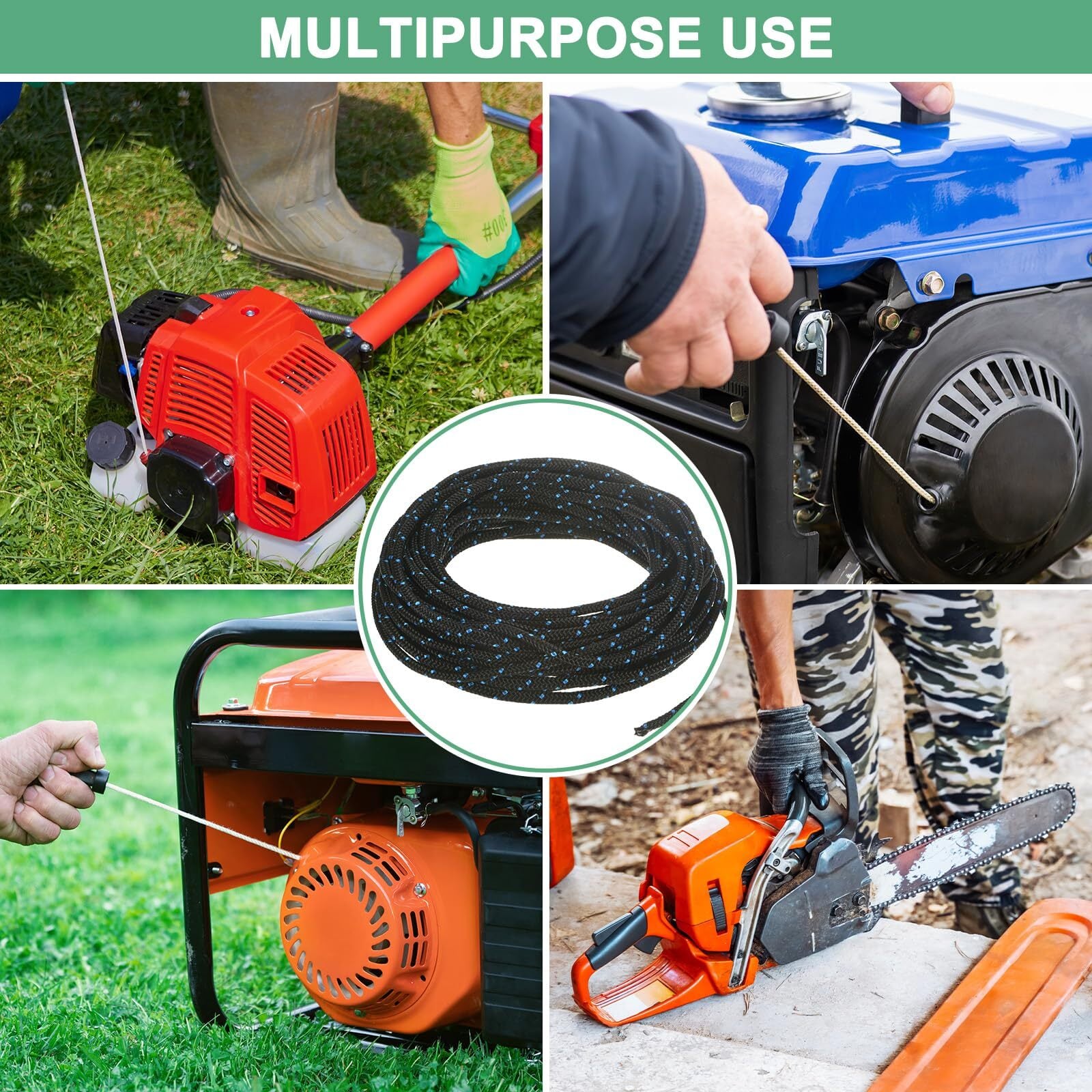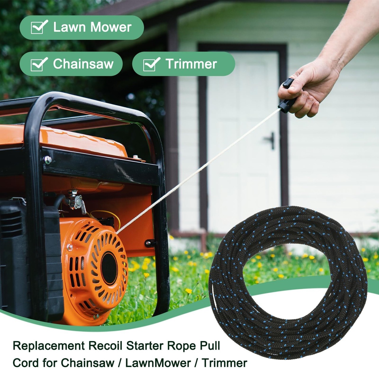 [多目的使用] - この芝刈り機用プルコードはさまざまな用途に対応しています。ガソリンエンジン式芝刈り機、ストリングトリマー、ヘッジトリマー、チェーンソー、芝刈り機、ウォーターポンプ、スノーブロワー、ミニ耕運機、耕運機、ログスプリッター、チッパーシュレッダー、高圧洗浄機など