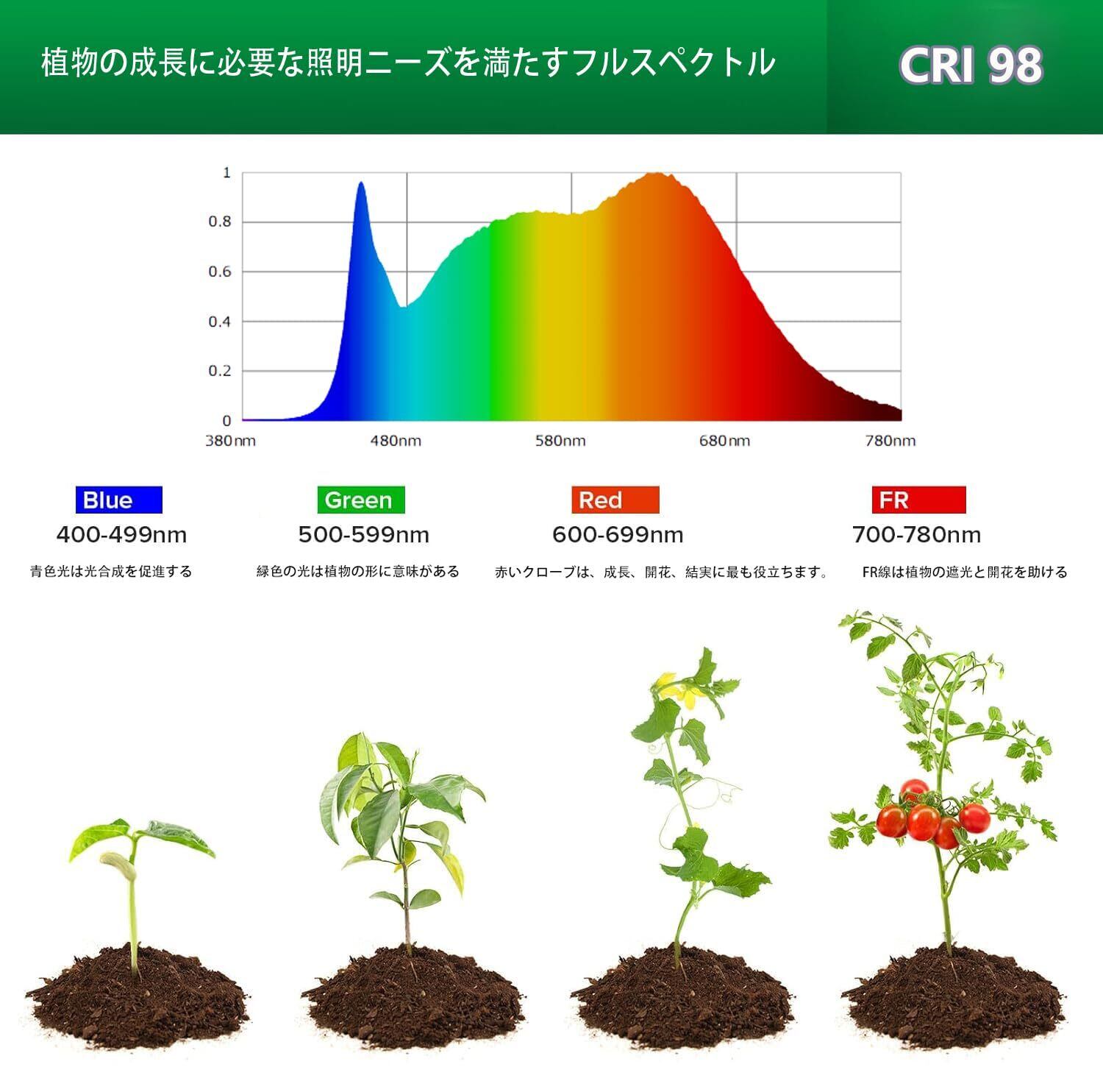 【Ra98の高演色】Ra98のCOBを演色性で評価します。 太陽光の見え方(Ra100)が自然に近く、植物の色を最も美しく見せます。 鑑賞力が高まるだけでなく、正確な照射により植物の光合成効率も向上します。 植物はより速く、より健康に成長します。植物の色がより鮮やかになります。