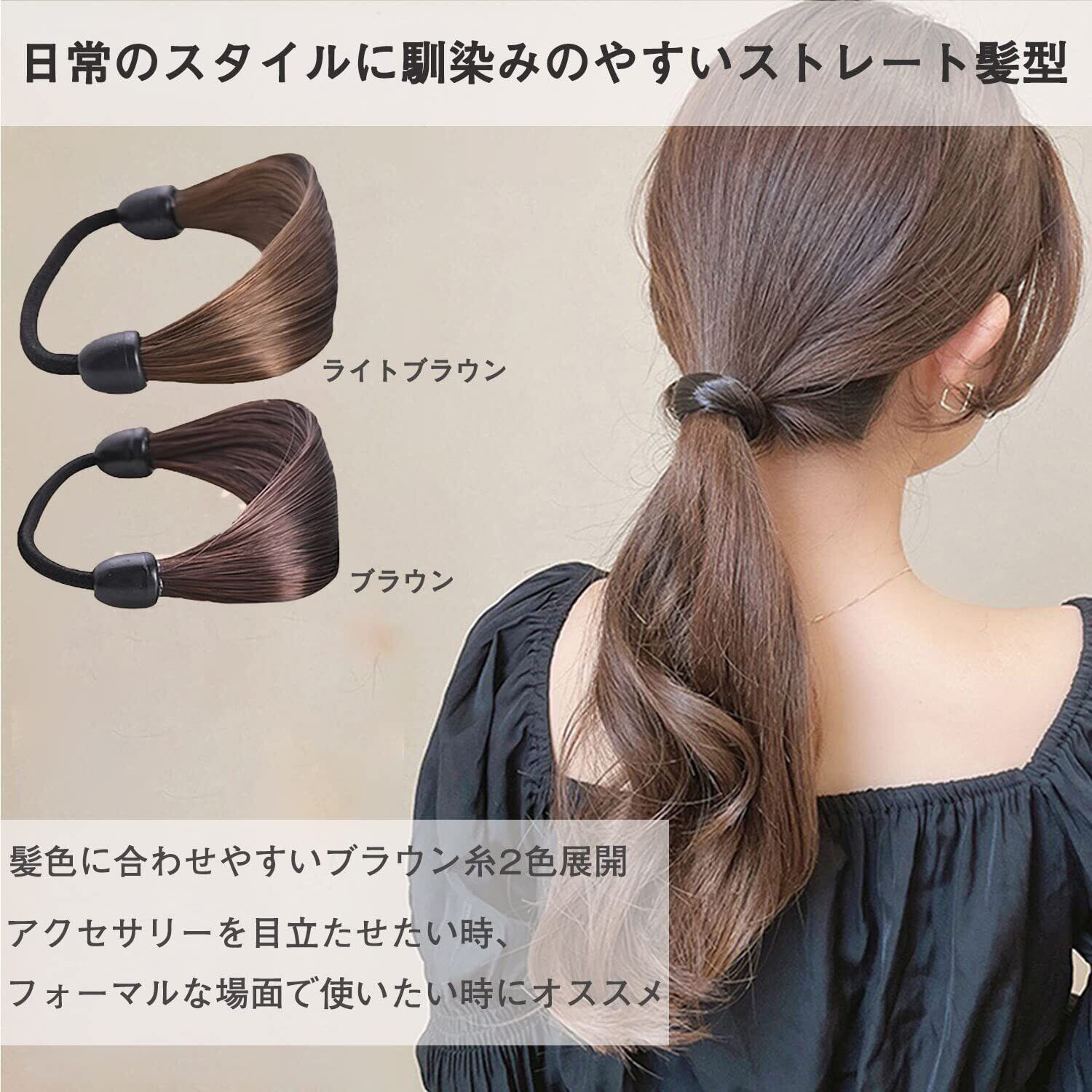 【自然なスタイル髪ゴム】髪の毛をぐるっと巻きつけたようなナチュラルなヘアスタイル。日本人の髪色に合わせたダークブラウンとブラウンの色で、それぞれのストレートと編み毛を採用してきちんとした印象に。また光沢感があり、地毛と色がマッチしていて自然な感じに見える。