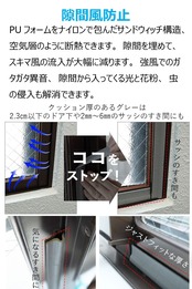 隙間風防止:PUフォームをナイロンで包んだサンドウィッチ構造、空気層のように断熱できます。隙間を埋めて、スキマ風の流入が大幅に減ります。強風でのガタガタ異音、隙間から入ってくる光と花粉、虫の侵入も解消できます