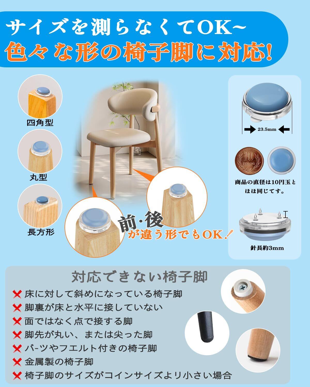 【サイズ不要・多形状対応】コインサイズ以上の木脚なら形状に関係なく取り付け可。マルチサイズ設計で四角・丸・長方形・前後異形脚にもフィット。採寸不要!両面テープ比べ 3.5 倍強固。