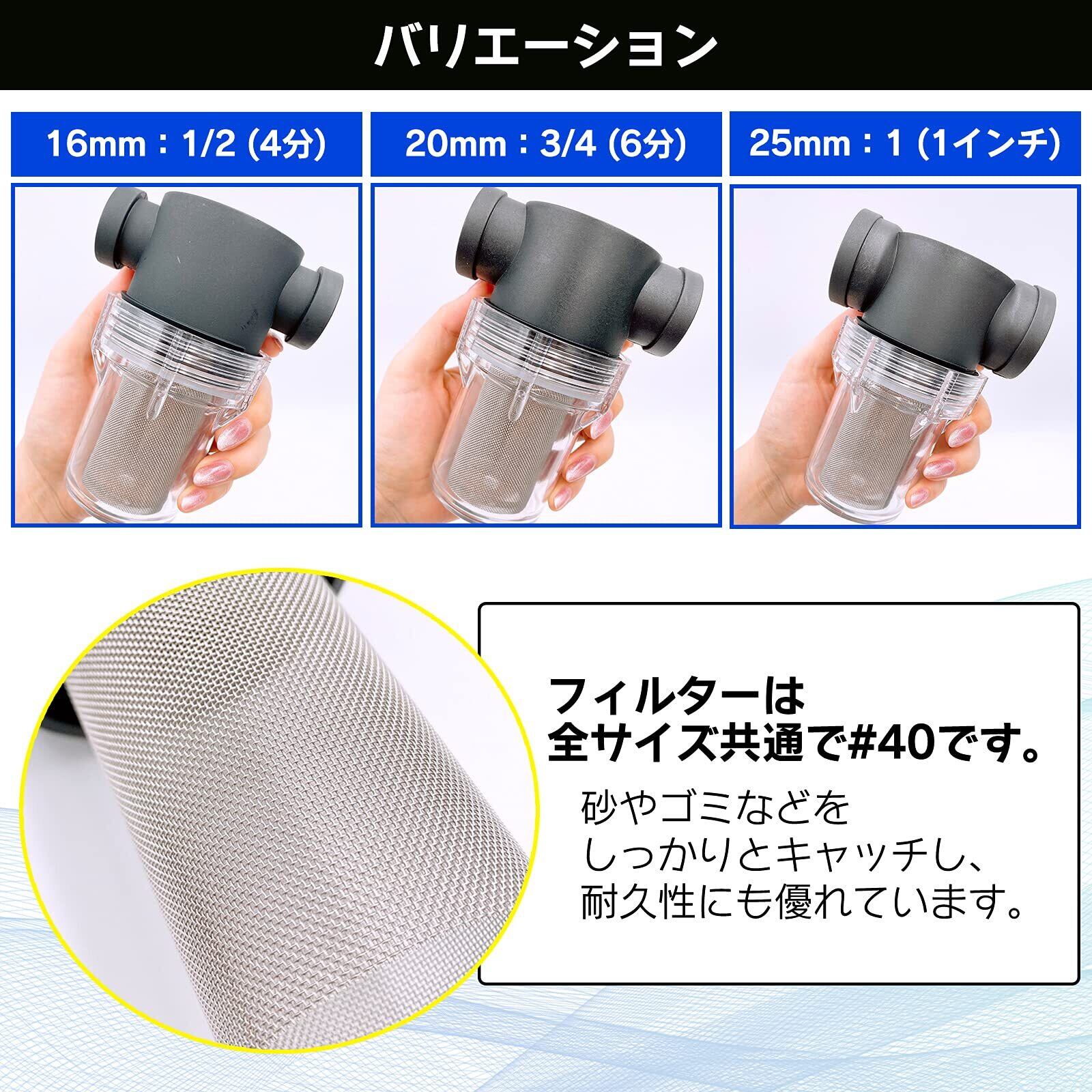 【バリエーション】 ■16mm 1/2 4分 ■20mm 3/4 6分 ■25mm 1インチ ※フィルターのサイズは標準#40になります。