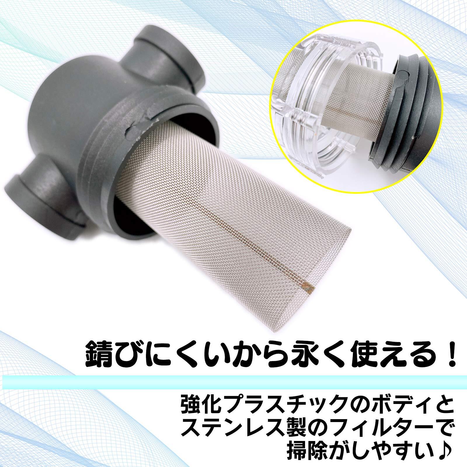 硬質塩ビ樹脂製なので金属とは違い錆びず、赤錆も出ません。 ボディは強化プラスチックで軽量かつ、スケルトンなので取り除いた砂やゴミが目視で確認出来ます。 また、水損失抵抗が少なく抵抗増加がほとんどなくフィルターはステンレス製なので長くお使いいただけます。