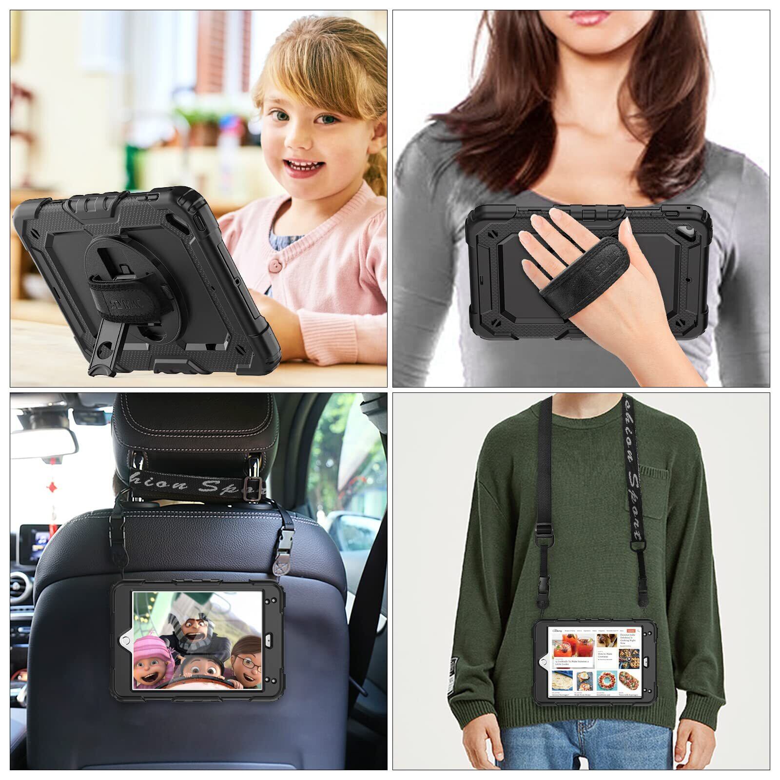 SEYMAC stock iPad Mini5/Mini4 ケース 耐衝撃 保護フィルム付き ペン収納 360°回転スタンド ハンドストラップ ショルダーストラップ 全面保護カバー (ブラック)
