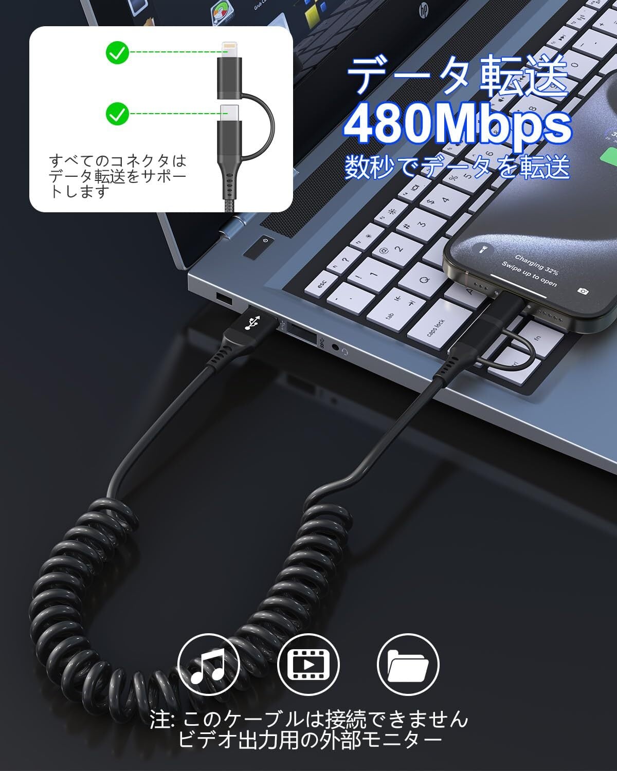 3A/2.4A急速充電器とデータ同期: このコイル状USB Cケーブルは、安全な高速充電 (3A) と高速データ転送 (480Mbps) をサポートしています。Samsungを1時間で0から90%、iPhone 15を45分で0から50%まで充電できます。ライトニングケーブル カールコイル状は、最大2.4Aの急速充電と480Mbpsの転送速度ですべてのApple規格を満たしています。iPhone 14/13/12を30分で0から50%、1時間で75%まで充電できます。