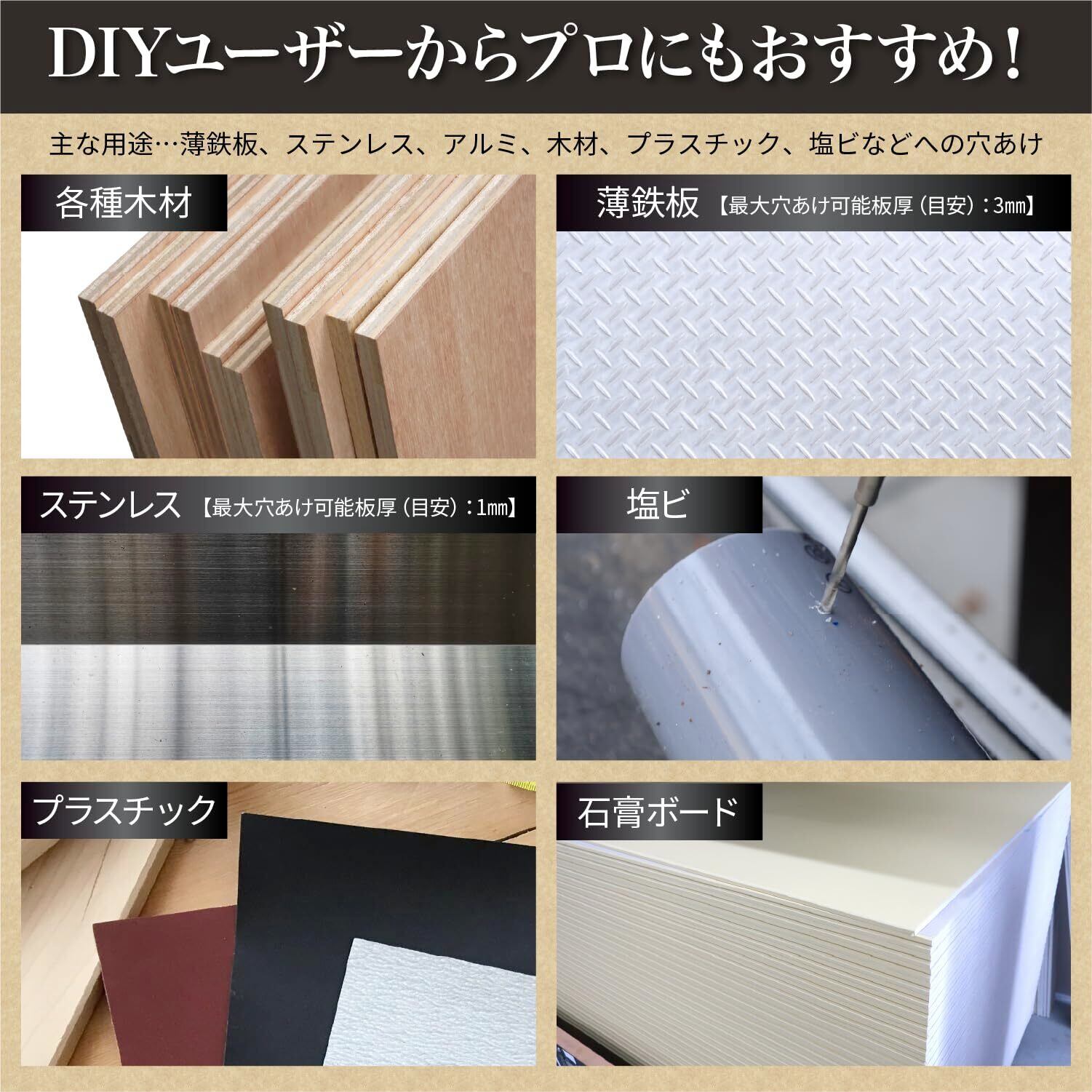 【適用材質】木材・合板、ステンレス板(1mmまで)、薄鉄板・アルミ板(3.2mmまで)、石膏ボード(内装用壁材/天井材)、プラスチックなど (金属への穴あけには切削油併用のこと)