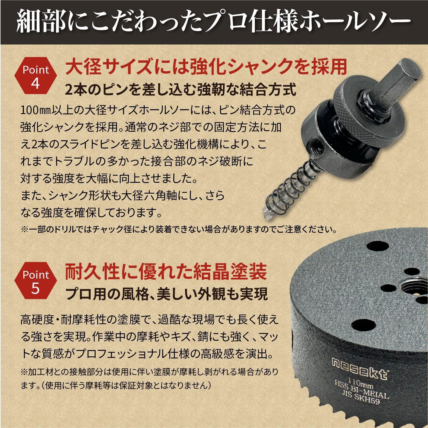 【材質】ホールソーの刃は薄く強靭なバイメタル材(JIS SKH59)を採用しスピーディーにきれいな穴あけが可能です。センタードリルにもこだわり、強度と性能のバランスに優れたHSS(ハイス)鋼材を採用しを実現します。