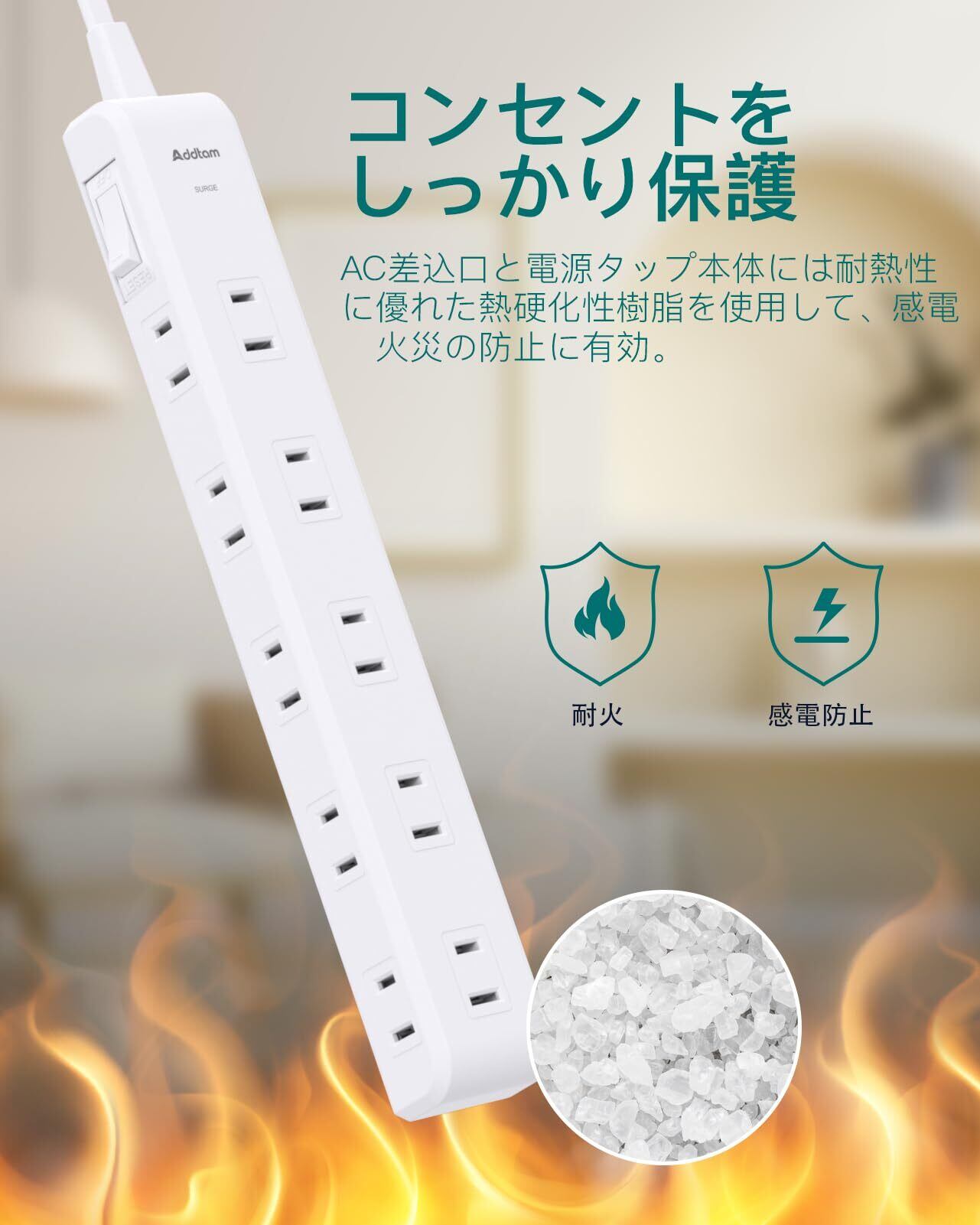 【雷サージ保護機能&コンセント4重保護】雷サージ保護機能より、サージ、電圧スパイク、電圧ノイズ、静電気による干渉を排除し、電気製品の耐用年数を効果的に延長します。ACプラグの根元に電気を通さない絶縁キャップがついており、トラッキング現象による火災の防止に役立ちます。さらに、万一の発熱の際にも融解しにくく、電気火災の防止に有効な耐熱性に優れた熱硬化性樹脂を使用しています。二重被ふくコードを採用されているので、断線や被ふく破れによる感電・火災の防止に有効です。