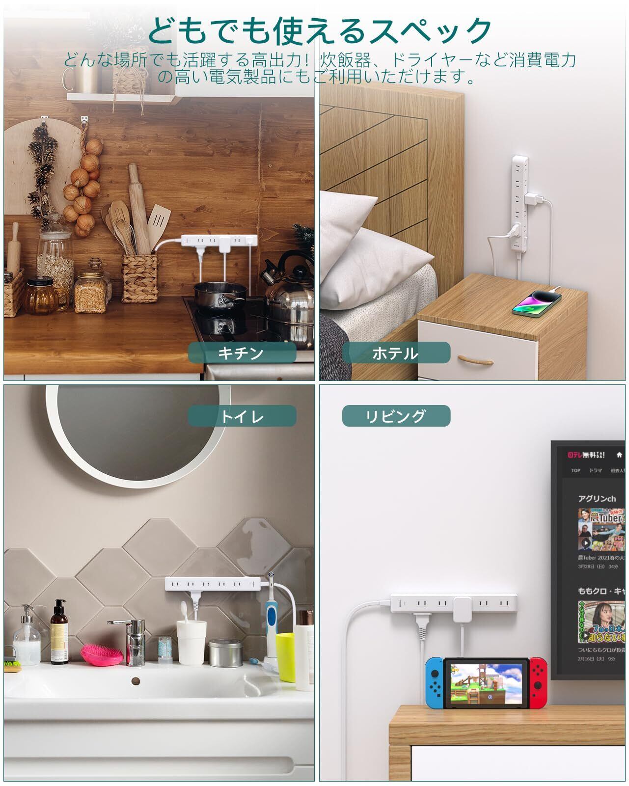 【10-in-1電源タップ&干渉しづらいデザイン】電源タップ は出張、会議室、自宅などで10台デバイスを充電できます。ACコンセントを2方向に分配して、どちら側からも気軽にケーブルを挿すことができます。また、180°スイングプラグを採用して、狭い場所でも配線しやすい。本製品は日本の電圧(100~125V)に合わせて設計されるので、日本国内、中国、米国または東南アジアでも使えます。