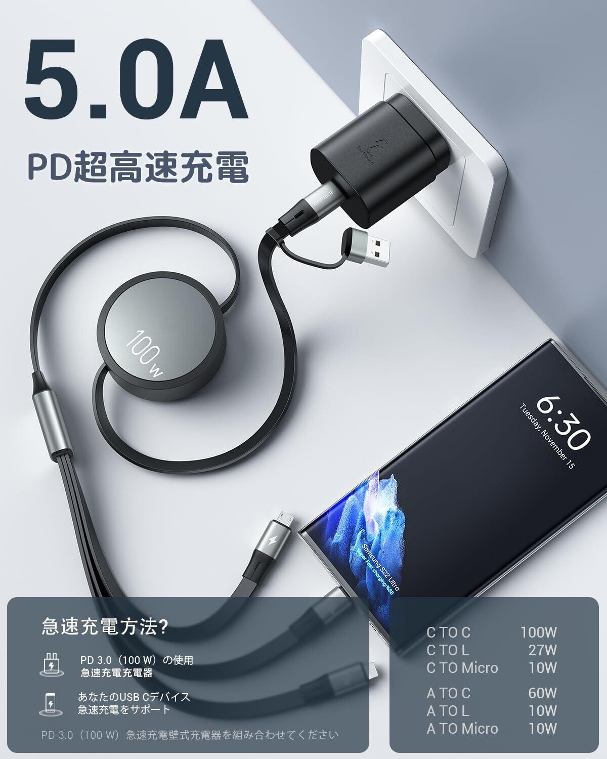 【3in2巻き取り式充電ケーブル&最大100W充電対応)】本製品は、100W対応のUSB-C巻き取り式充電ケーブルです。2in1のUSB-A/USB-C入力ポートと、3つの充電ポート L/タイプ C/マイクロ USB)を搭載しており、ケーブルの絡まりを解消します。2in1入力ポートはUSB-AとUSB-Cの2種類の充電器と互換性があります。※注意:Type-C出力ポートのみが最大100Wの充電と480Mbpsのデータ転送をサポートします。それ以外のポートは充電専用です。USB-C to USB-Cケーブルは最大100Wの充電速度を提供し、Samsung Galaxy S23/S22を30分で80%まで充電可能です。高速充電を体験するには、60W以上の充電器をご使用いただくことをお勧めします。なお、実際の充電速度は、お使いのデバイスと充電器によって異なります。ご注意:100W超高速充電実現の場合は100W充電器をご使用ください。