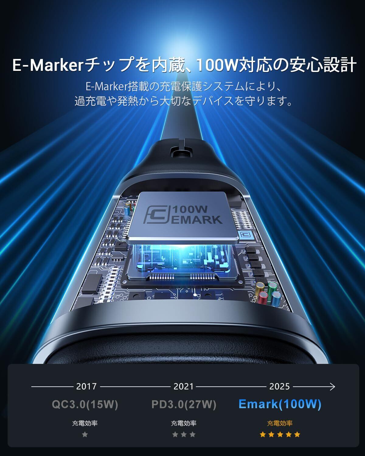 【第7世代進化モデル&E-Markチップ搭載】CAFELEの第7世代高速充電ケーブルは、ユニークなデュアルスマートチップデザインを採用しています。最大5Aの電流を提供するUSB-C to USB-Cケーブルで、MBook Proを30分で65%まで超高速充電が可能です。さらに、過熱や過充電を防ぐ新デザインにより、あなたとあなたのデバイスを安全に保護します。充電速度に満足できない方は、ぜひ当製品をご検討ください。