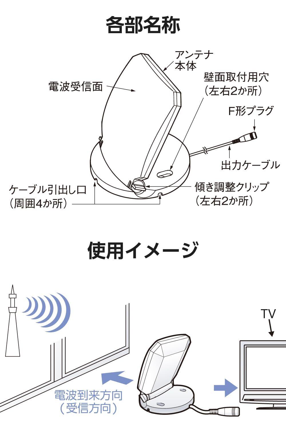 スマートですっきりしたデザインで、設置場所を選ばず、テレビ端子のないお部屋でもテレビが楽しめます。独自の傾き調整クリップで、アンテナ受信面を0~90度の範囲で無段階に調整・固定可能。最適な受信感度に調整ができます。