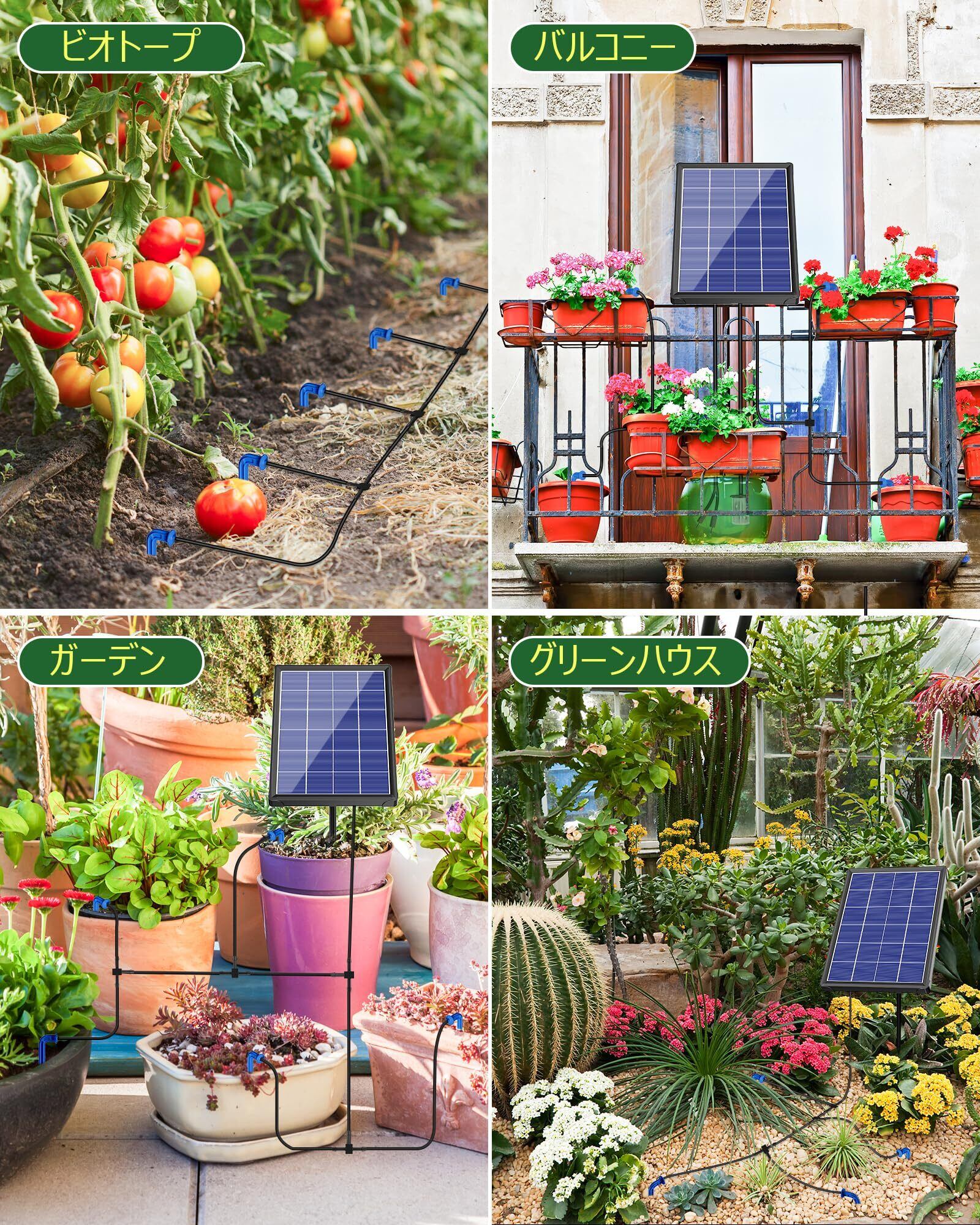 [ソーラー自動灌水器]電源も水道も要りません。ソーラーパワーで自動給水、複雑な配線等が一切いりません。太陽光で動くポンプが水タンク(別売り)からチューブを通して複数のノズルに自動配水目的と規模に応じた水やりを実現出来します。2200mAh充電電池内蔵していますので、曇りの日でも給水可能。