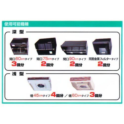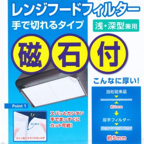 特徴:厚手フィルター(約5mm)により吸油力が約2倍! (従来品は約2.4mm)面倒な取替え回数が減ります!