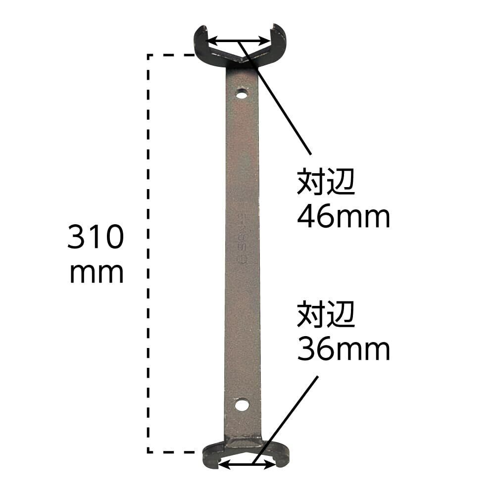ワンホール混合栓(対辺約36mmと46mm)のロックナットをまわす時に使用します。シンク下のスペースは大変狭く、横に回転させる通常のスパナ等ではうまくロックナットを回せない場合があります。立形締付工具は長さ310mmと長く、少ないスペースでもロックナットの取り付け、取り外しが行えます。