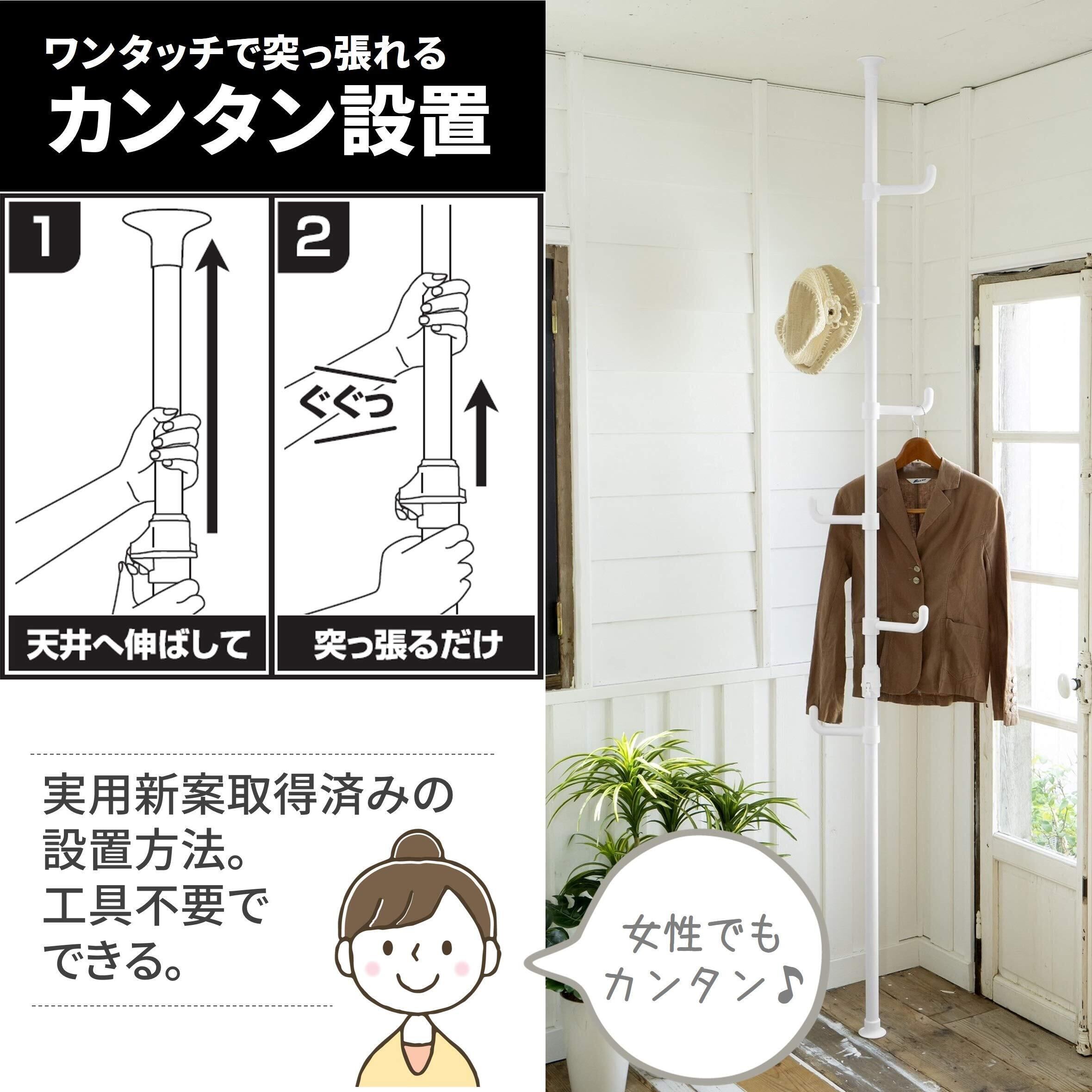山善(YAMAZEN) 突っ張り ラック ポールハンガー 全体耐荷重30kg ワンタッチ突っ張り (実用新案取得済) 高さ190-260cm コートハンガー 玄関収納 一人暮らし 子供部屋 組立品 マットホワイト WJ-725RM(MWH) シングル