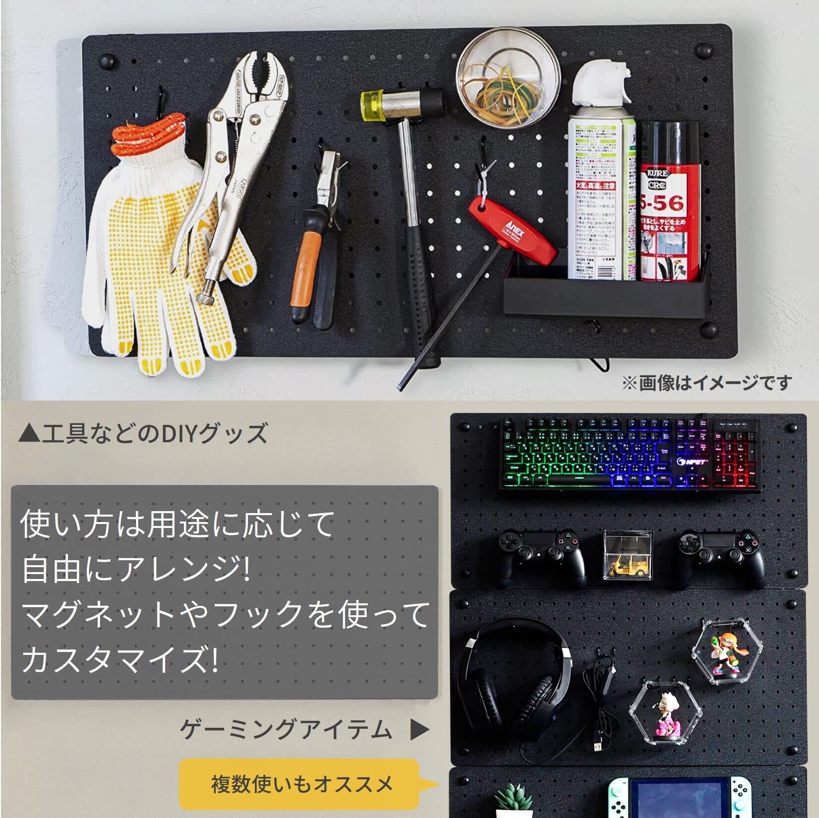 マグネットにも対応している有孔ボード。孔間隔25mm・穴径5㎜の有孔ボードフックに対応しているのであらゆる場面で活躍できます。【キッチン】キッチンツールを掛けたり、マグネットのタイマーを付けたり【玄関・リビング】カバンや鍵などの収納に【DIY】工具の引っ掛け収納に【KIDS】学校からのプリントや写真を貼ったり【デスクサイド】文房具などの収納に【ゲーミング収納】キーボードやヘッドホン、マウスなどの収納に