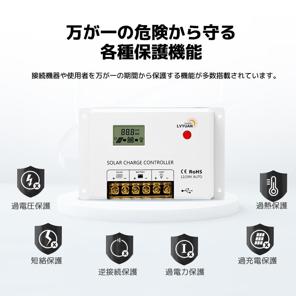 【リチウム電池活性化】 LVYUAN(リョクエン) PWM 30A ソーラーチャージコントローラー12V24V兼用 USB5V出力付き 液晶画面付き 船舶 野外 車中泊 災害対策 地震停電 防災予備品 太陽光発電専用 国内仕様【日本語説明書付き】 HC2430
