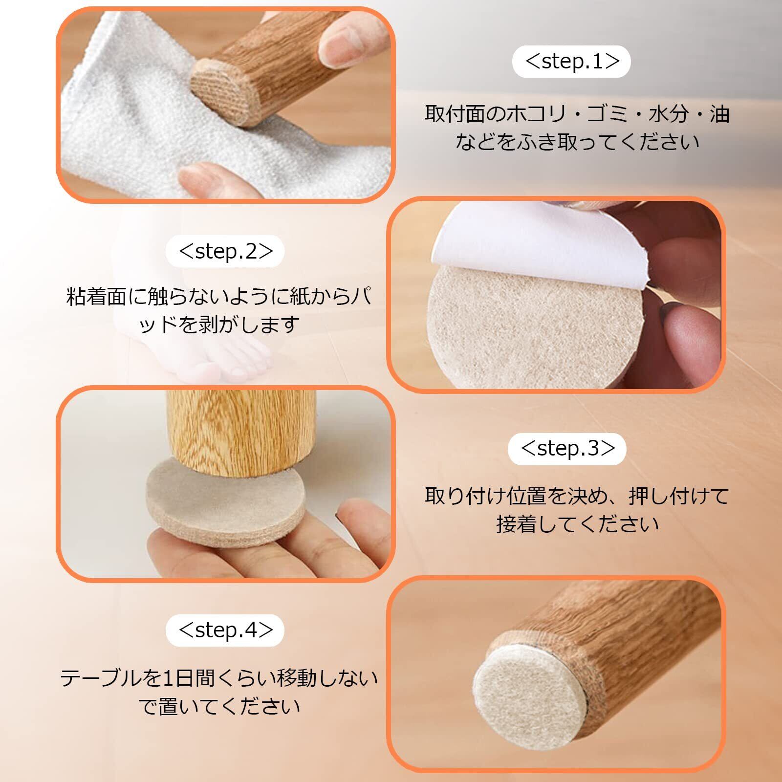 【安心な3Mテープ採用&高密度繊維素材】 高密度繊維での家具保護パッドが強度な3M接着剤を付きます。保護パッドが強度な接着剤があり、操作も簡単で、ただ白い紙を剥がし、イス、家具、小物などに貼るだけ!※固定位置に30秒くらい押して貼り付けてください。また、良質なポリエステルを採用しており、耐摩耗性に優れ、長期使用でも大丈夫です。