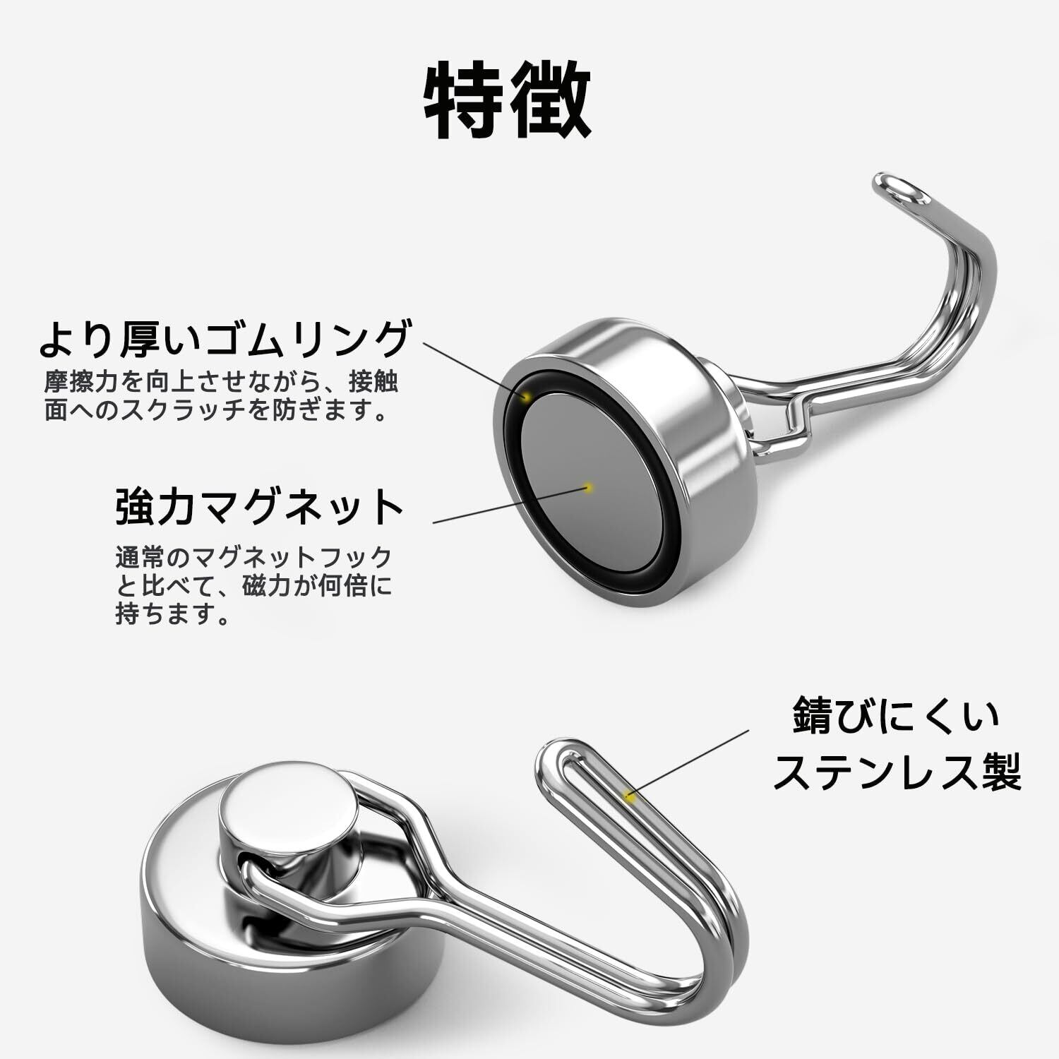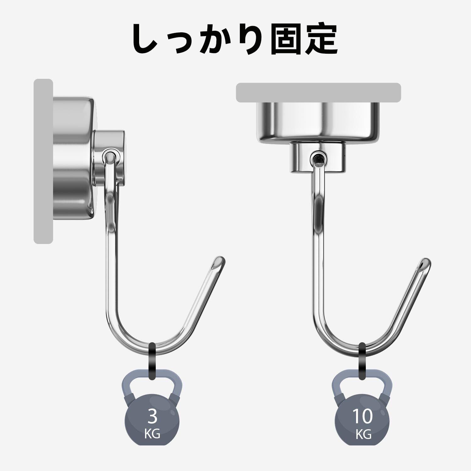 【強力な磁力でしっかり固定】Homionのマグネットフックは、垂直耐荷重10kg、水平耐荷重3kgの強力な磁力を持ち、扇風機、バスルーム用品などの吊り下げに最適です。ゴミ袋やバケツなどの軽量アイテムから、鍵やキッチンツールまで、さまざまな用途に対応します。
