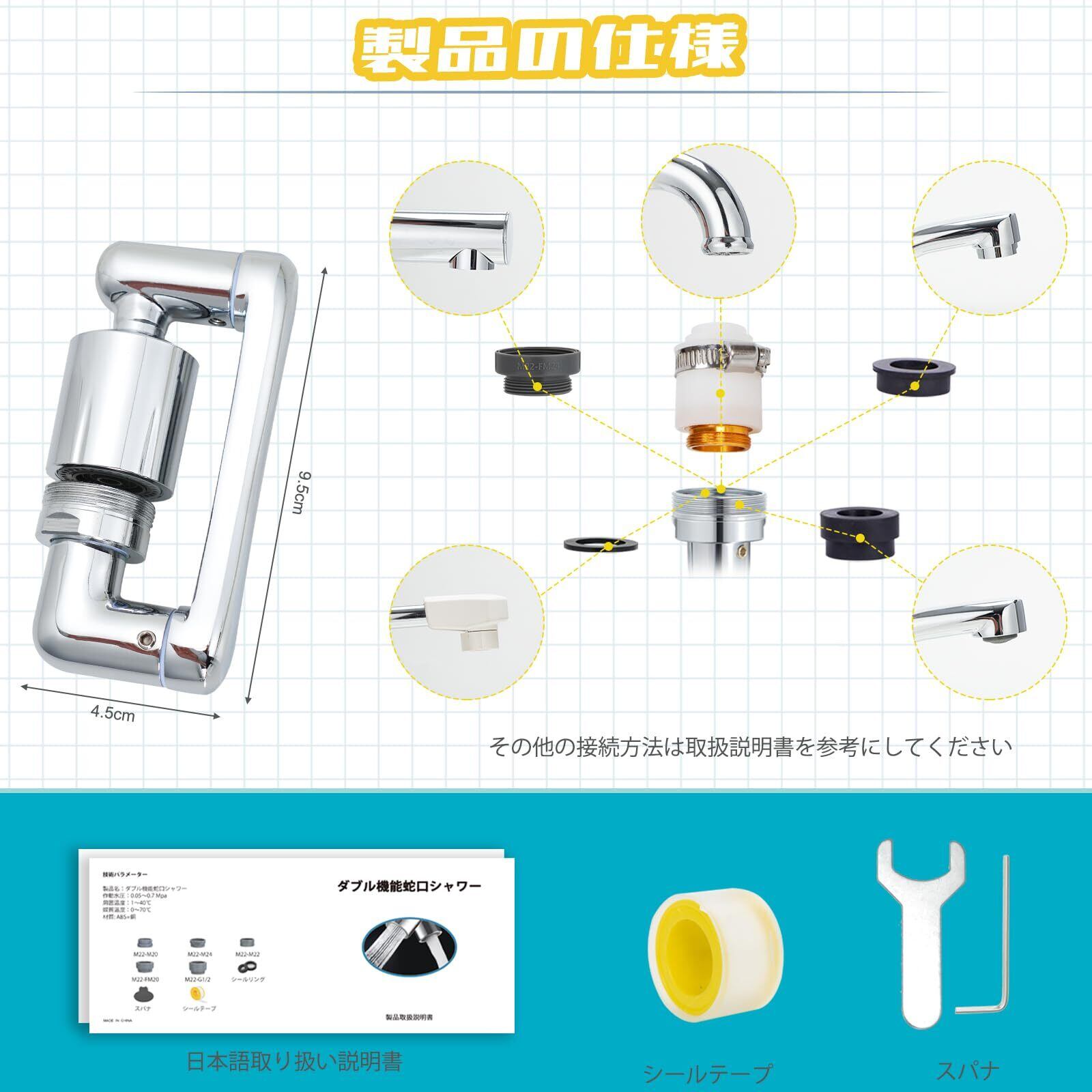 この節水蛇口シャワーヘッドは、水の使用量を30-40%削減できるため、環境に優しく、水道料金の節約にもなります。首振り機能があるので、水流の角度を自由に調節できます。 取り付けも便利で、従来の蛇口ノズルと交換するだけで泡沫とシャワーを使って水を出すことができます。バスルーム、トイレ、マンションなどに適しています。キッチンにも使用可能なので、食器の洗浄にも最適です。このシャワーヘッドは、高品質のABS樹脂と真鍮、耐久性に優れています。