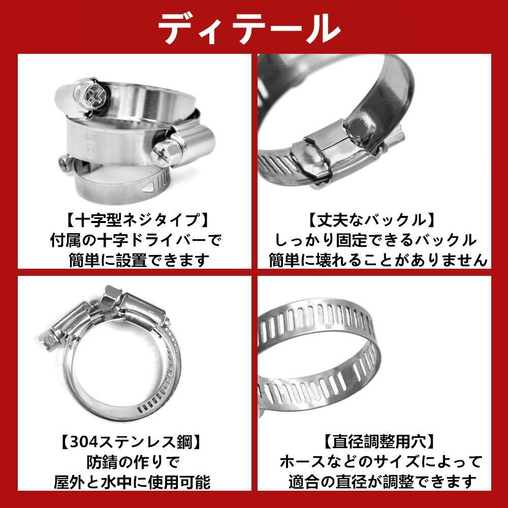 【耐久性が高い材質】材質:304ステンレス鋼。本製品は耐食性に優れた304ステンレス鋼を採用して、密閉を長く保ち、雨がかかる場所で使っても安心してお使いいただけます。ホースクランプは素晴らしい性能、高靭性、抗酸化、耐腐蝕、耐高温800度などの特徴を持っています。強力、確実に締め付け可能です。また、アプリケーションゾーンの周りに均一に圧力を分散するように設計されています。