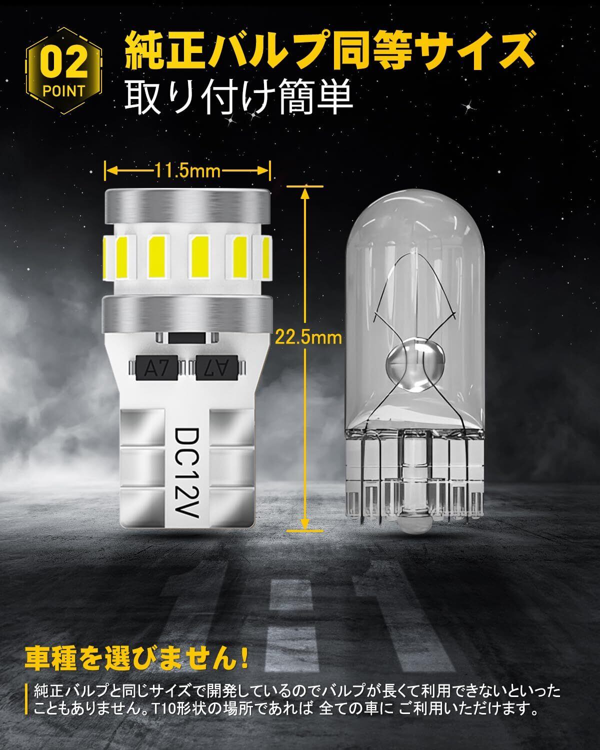 【ポジションランプとして使用の場合】AUXITO T10LEDランプは360度全方位照射。シャープな光でワイドに明るい!バルブ本体に贅沢にLEDチップを搭載することで、純正ハロゲンに比べ360度全方位へ光をムラなく照射し視認性が抜群です。【ルームランプとして使用の場合】クリアな光が社内をムラなく照らし車内の視認性が高まり快適です。