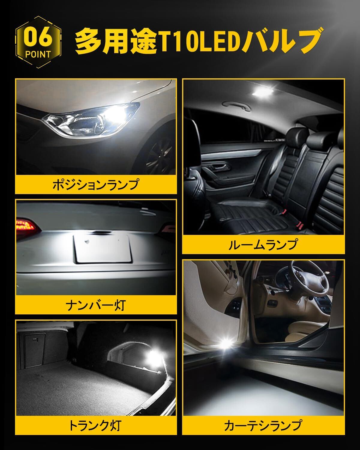 【取り付け簡単&多用途 LEDバルブ】:純正T10ハロゲンと同等の大きさで、取付簡単、差し込むだけで使用可能です、手間がかかりません。ポジション、ナンバー灯、ライセンス、ルームランプ、ドア下ランプ、トランクルームなどに最適なLEDバルブです。ご注意:本製品は日本国産車対応品で、輸入車に取付ると、「ちらつき」や「不点灯」などの不具合があります。