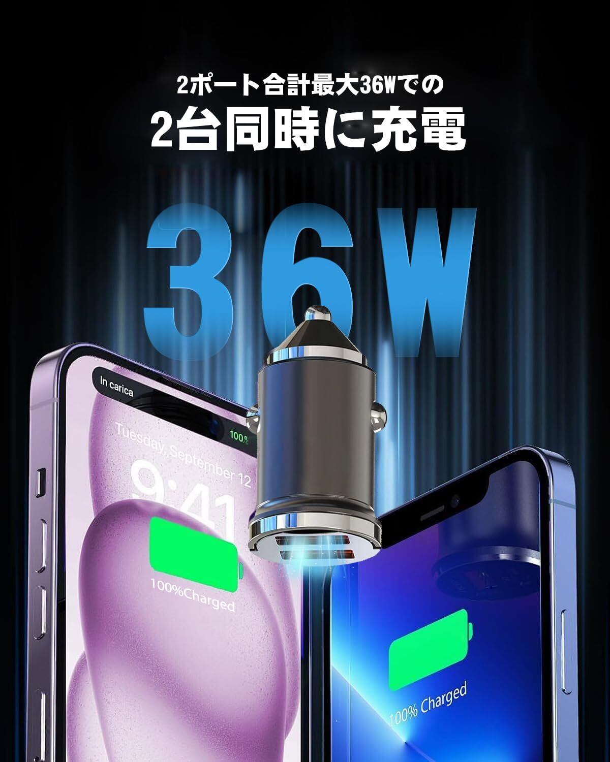 【幅広い互換性】12V/24V入力に対応しています。一般乗用車で主に使用されている12V規格はもちろん、トラックなどの大型車両の24V規格のシガーソケットでも使用が可能です。幅広い車種のドライバー様にご使用いただけます。対応iPad Pro/iPad Air/iPad mini/iPhone15/14/13/SE/12/11/X/8/Xperia/Motorola/Sony対応などスマホに対応。