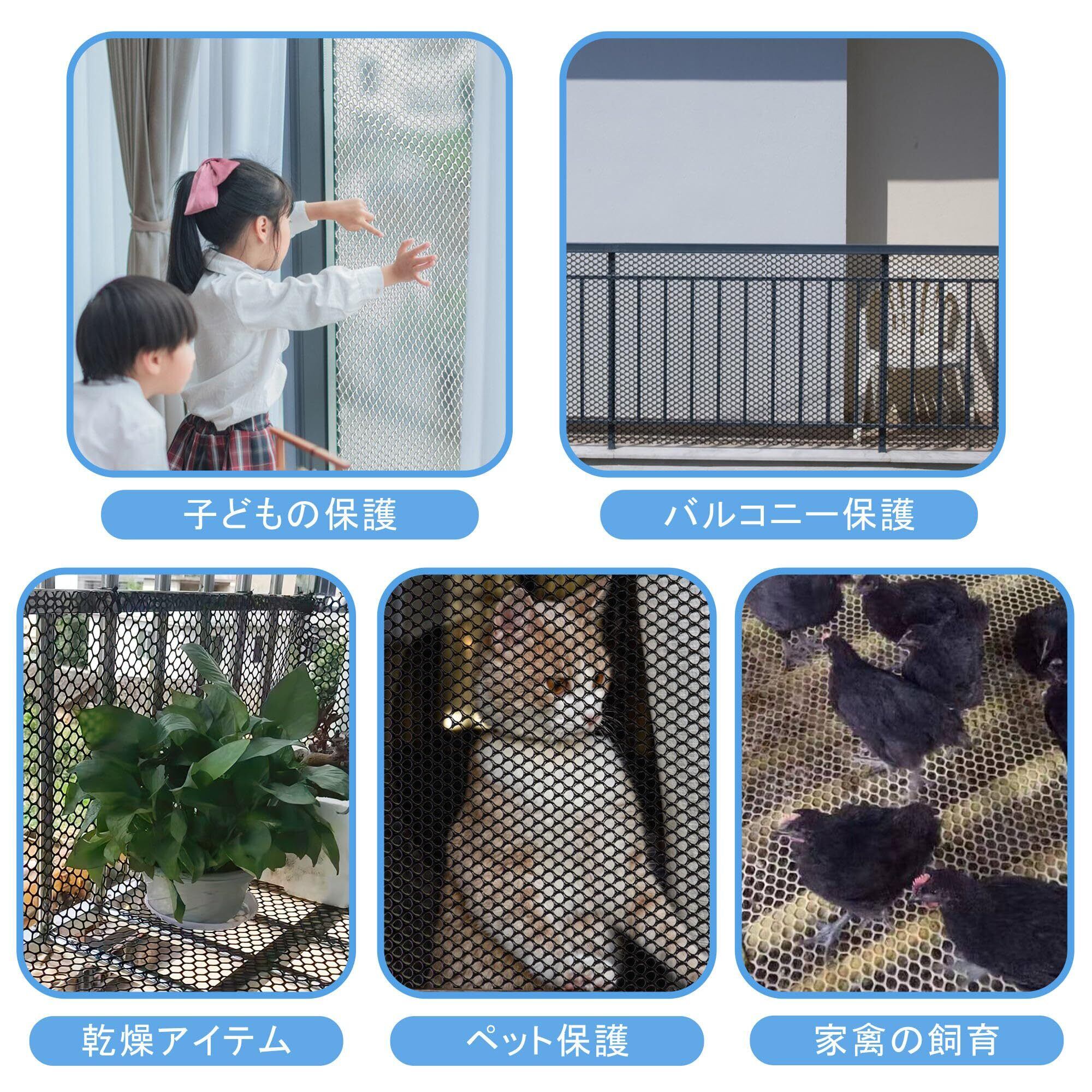 【高品質落下防止ネット】HDPE素材を採用し、一般的なナイロンに比べて丈夫で長持ち。猫の噛みつきにも強く、破れにくい設計です。また、日光や熱にも耐性があり、悪天候の中でも長期間使用可能。通気性も確保しており、視界を妨げないデザインです。