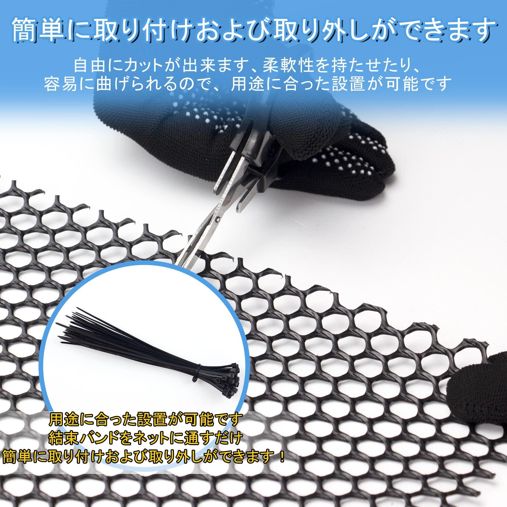 【任意のサイズにカット】付属の保護手袋とハサミで簡単に好きなサイズにカット可能。湾曲した箇所や隙間など、細かな場所にもぴったり対応できます。取り付けは結束バンドで固定するだけ。取り外しもスムーズなので、誰でも手軽に設置できます。