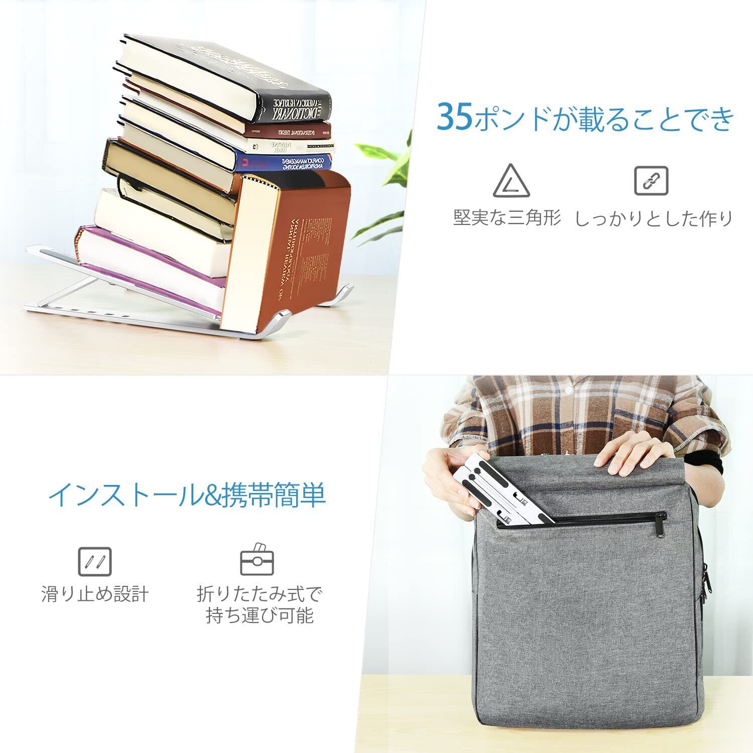 【持ち運び便利&滑り止め保護ゴム付】折りたたみ式ノートパソコンスタンドなので、簡単に折畳ってカバンの中に収納して持ち運べてでかけて、カフェや新幹線、飛行機移動中、出張、展示会など様々シーンに活躍できます。PCスタンド下にキーボードなどを収納できて、デスクスペースを有効に活用します。使わない時に折畳って隣に置いて邪魔しないです。パソコンが当たる部分にはシリコンゴム製の滑り止めが施されているので落下の心配なく使用が可能。設置面に長くて広い二個、フック内側に二個、足外側に二個、底部には四個、総計十個滑り止め用のシリコン製パッドがあり、全面的に大切なパソコンを守ります。スタンド接地側も滑り止めが付いているので、デスクに置くと滑りにくく安定して使えます。注意:スタンドが斜めになる台面と水とかある台面に置かないでください。