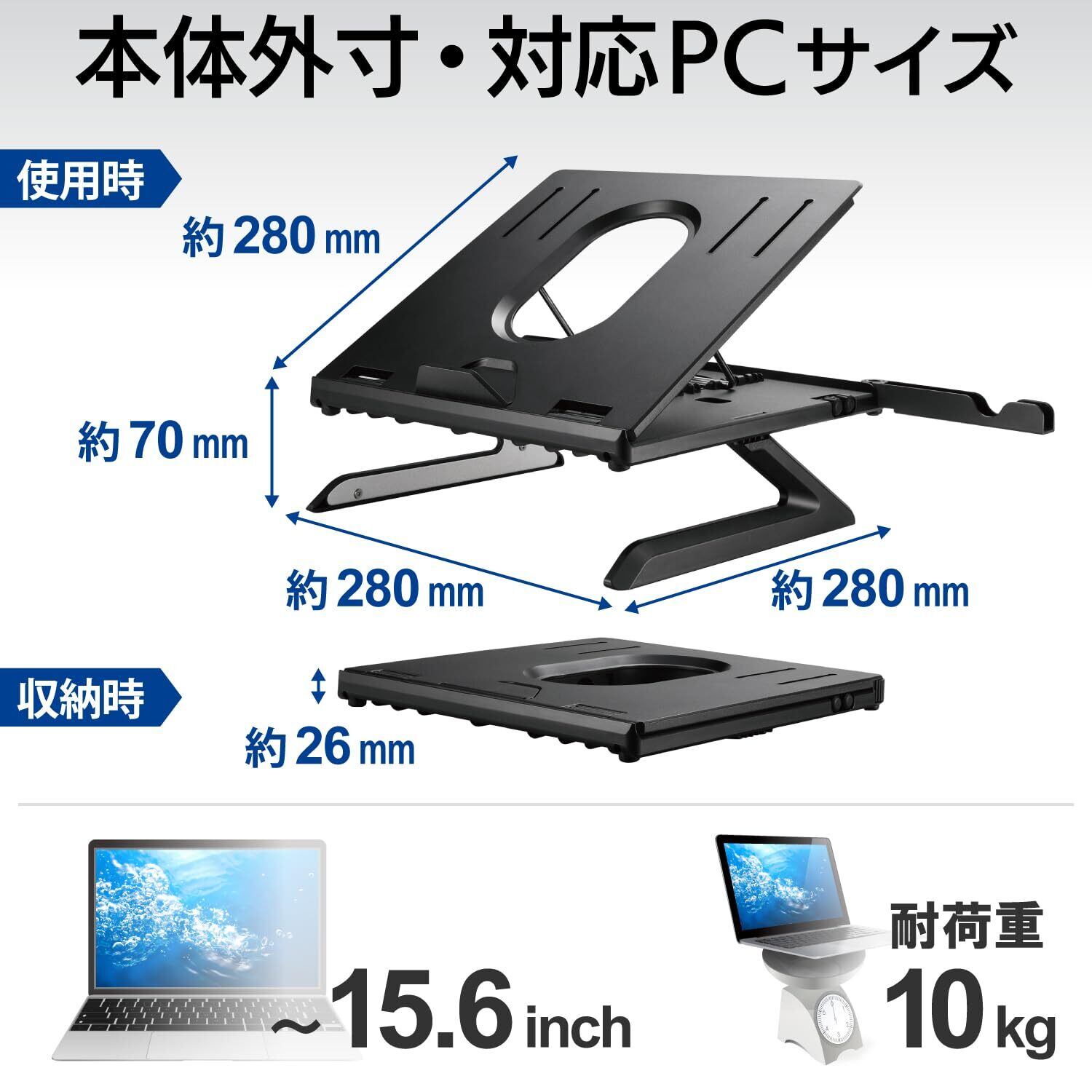 エレコム ノートPCスタンド 折りたたみ 8段階 9.5cm高さアップ脚 スマホスタンド付 ~15.6インチノートPC対応 折りたたみ時サイズ:幅280×奥行280×高さ26mm 耐荷重:10kg ブラック PCA-LTSH8BK