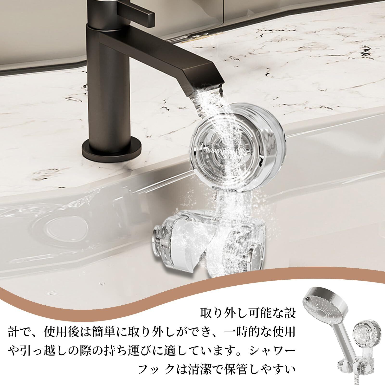 【取り外し可能なデザイン】 :便利で柔軟な取り外し可能なデザインにより、使用後は簡単に取り外せ、臨時使用や引越しの際に持ち運ぶのに適しています。シャワーフック清掃や収納も簡単です。