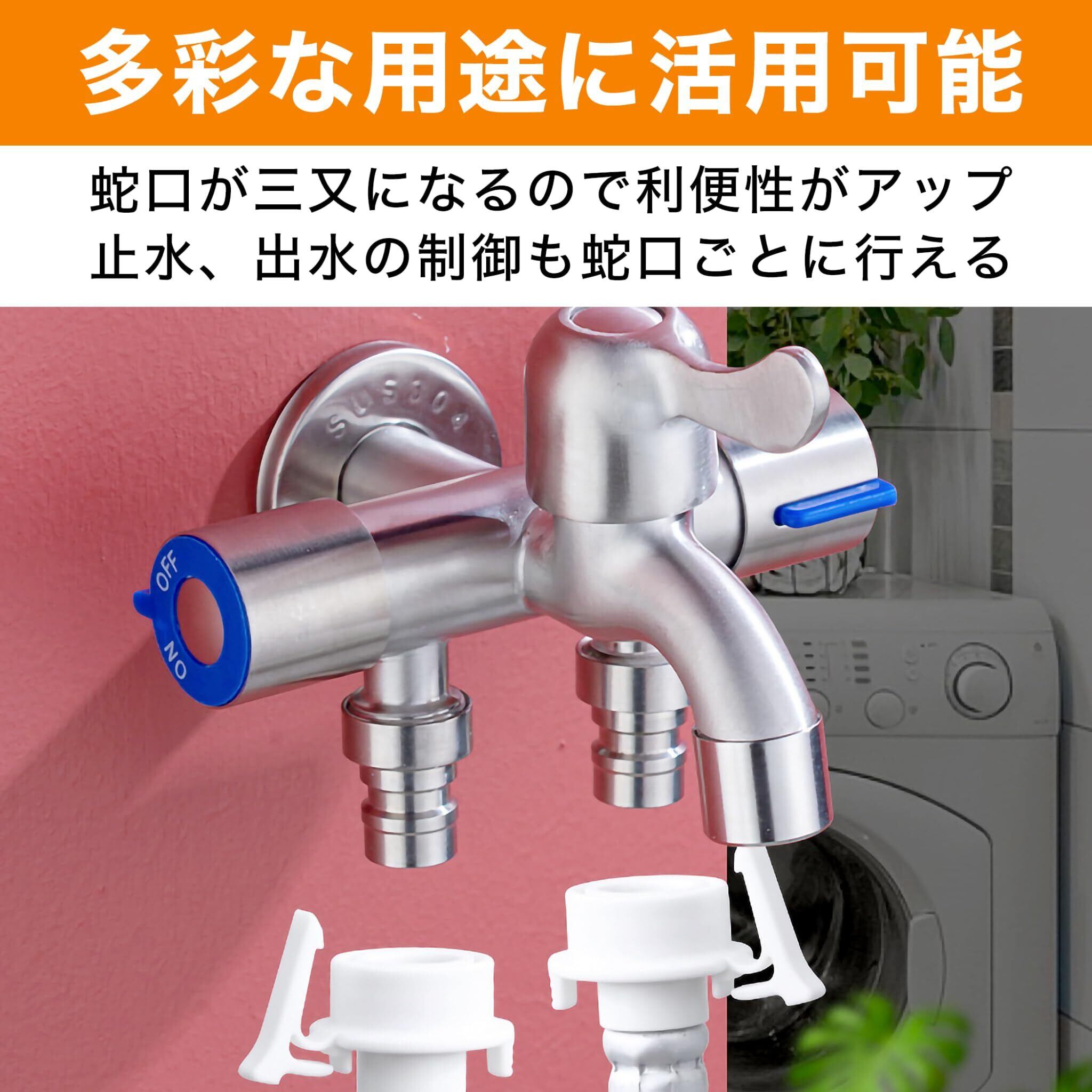利便性の高い三又分岐水栓金具:一つの蛇口だけでは洗濯や散水などを同時に行えませんが、三又分岐水栓金具を使えば蛇口が三又になるので利便性がアップします。水量調整や止水、出水の制御も蛇口ごとに独立して行えるので、多彩な用途にご活用いただけます。