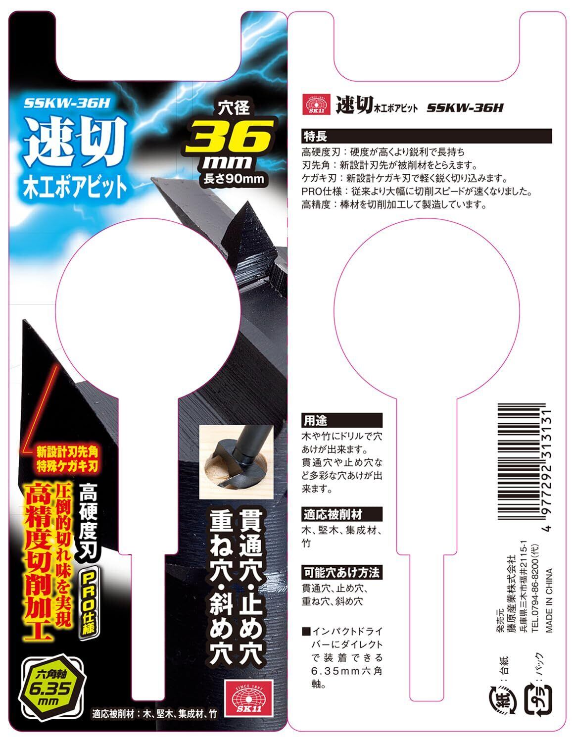 SK11(エスケー11) 速切木工ボアビット 6.35mm六角軸 穴径36×全長90mm SSKW-36H