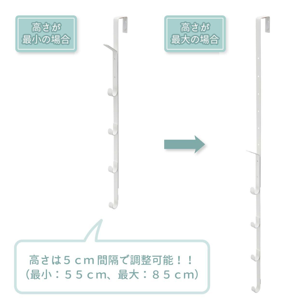 ・高さを5cm間隔で7段階に調整可能。下のフックはお子様の手が届く高さで収納でき、上のフックは大人の帽子やバッグなどを掛けると便利に収納できます。