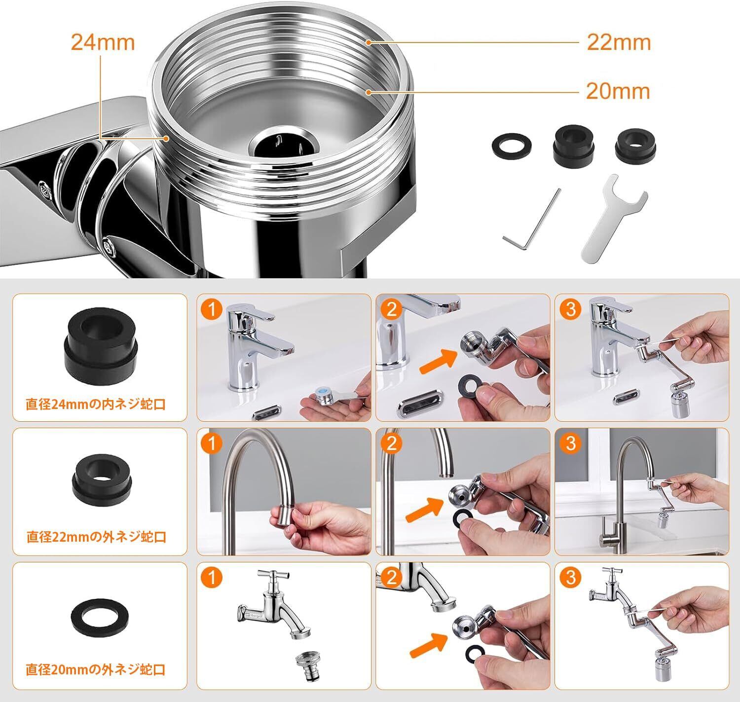 【豊富なアダプター・取り付け簡単】:蛇口のサイズ違いのゴムパッキンが3種類付属しているので互換性が高く殆どの蛇口に対応可能です。きつく締めて、付属のシールテープを巻くと水漏れもなく快適に使えます。素人でも簡単に取り付けできます。※何種類形の蛇口が御座いますので、ご自宅の蛇口サイズを事前にご確認ください。