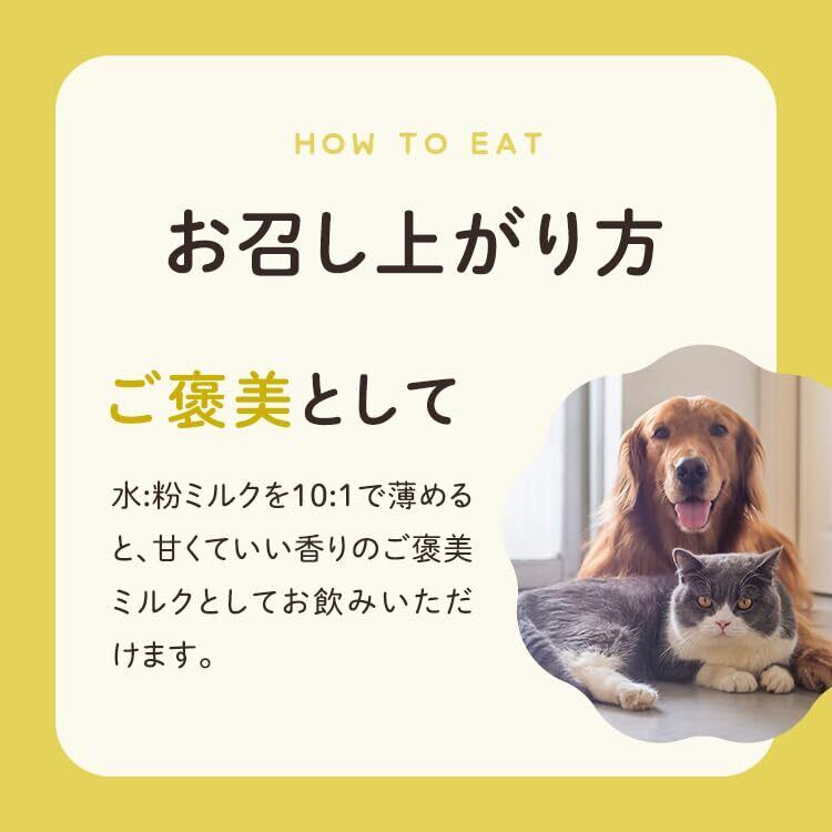 ●使用方法:体重3kg毎に付属の計量スプーン1杯分(約3g)を目安にお与えください。ミルクとして与える場合は粉ミルク1:ぬるま湯10(5g:5cc)でご使用ください。※ペットの好みに合わせて濃さを調整してください。