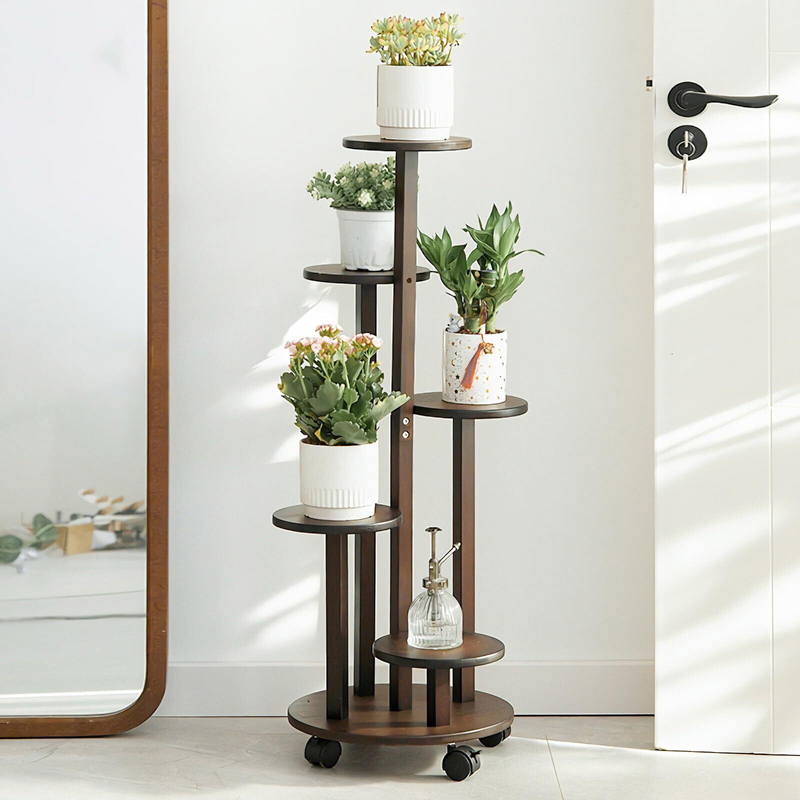 SmartMaster フラワースタンド 花台 室内外兼用の5段 プランタースタンド 園芸ラック 観葉 植物 花棚 リビングルームバルコニーグリーンディルフラワーポットスタンド 組み立てが簡単 移動が容易 指向性キャスター 耐荷重30㎏ おしゃれ 飾り 収納 (茶色)