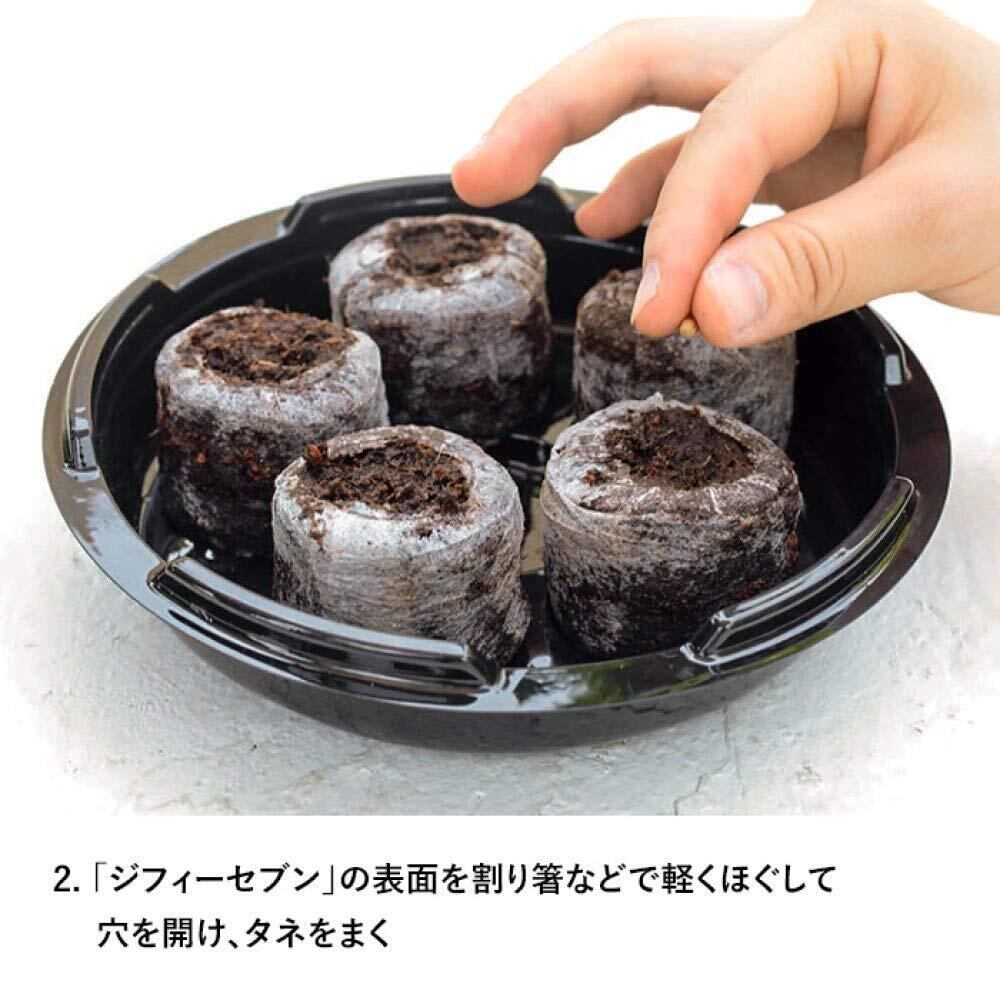 【使用方法】育苗ポット「ジフィーセブン」を育苗トレー(育苗箱)に入れて給水し膨らませ、種をまきます。温度が必要な場合はドームを被せましょう。芽が出たら元気な苗を1本残し他は間引き、ポットごと植え替えてください。育苗が20日以上長期になる場合は、適宜活力液を与えます。場所も取らないので清潔な室内で育てられる栽培キットです。